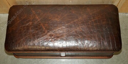 This is a very well made example of a large ottoman, it has normal cow hide leather upholstery which has been embossed with the pattern of Alligator or Crocodile. The frame is 1860 mahogany and has a glorious patina to it. The upholstery is heritage hide, this type of hide is designed to look 100 years old from new, it has the imperceptions of the hide included and marks up quite easy, all with a view to looks as old and authentic as possible