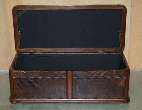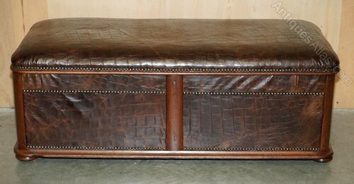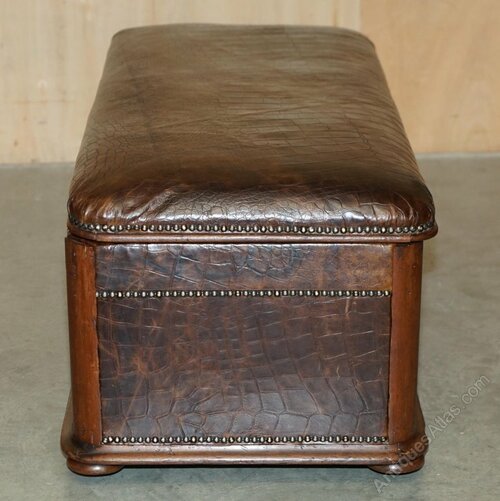 We are delighted to offer for sale this absolutely exquisite, lightly restored, hand dyed, Crocodile or Alligator patina leather 1860 ottoman trunk with a Mahogany framePlease note the delivery fee listed is just a guide, it covers within the M25 only for the UK and local Europe only for international, if you would like an accurate quote please send me your postcode and I’ll provide you with the exact price