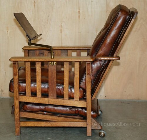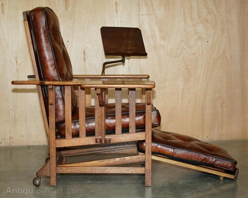 The chair reclines as you can see in the pictures by move the rear bar, it has a pull out, height adjustable footstool, the reading slope is fully articulated, this chair really is quite sublime and in amazing condition