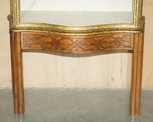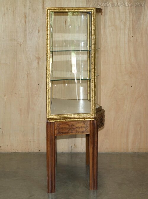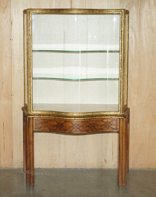 What a find, this is the editors choice piece for this month, it has a Chippendale style carved solid platform base, Chippendale style carvings all over the top display section that has the original high Victorian gold gilding, this piece is pure quality. The glass is serpentine curved which was insanely expensive when this was made, only the finest glass blowers could make panels like this, for every one that succeeded there would be thousands that failed to achieve the sophistication of this curve