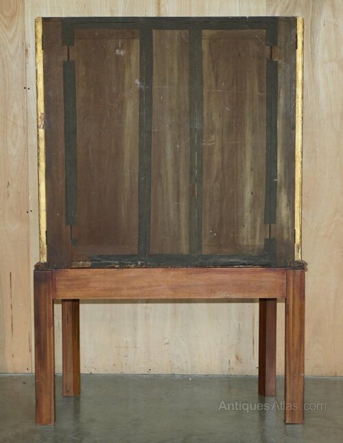The cabinet has two very large glass shelves mounted by the original phosphor bronze fittings, each door has a small lock and key which does work to an extent, they are very small so with some wiggling the doors unlock