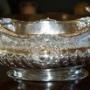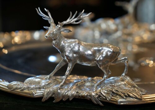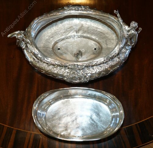 The shaped oval bowl depicting the myth of Diana and Actaeon, cast with the figures of the goddess Diana, with a quiver of arrows across her shoulder at one end, being surprised by Actaeon at the other end, each seated next to a hound, each side with a chased coronet, one above a vacant reserve, the other reserve chased with two intersecting arms, the integrated base tray with stags and deer, with reeded scrolled handles,