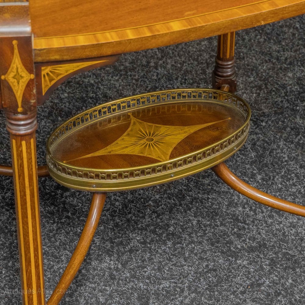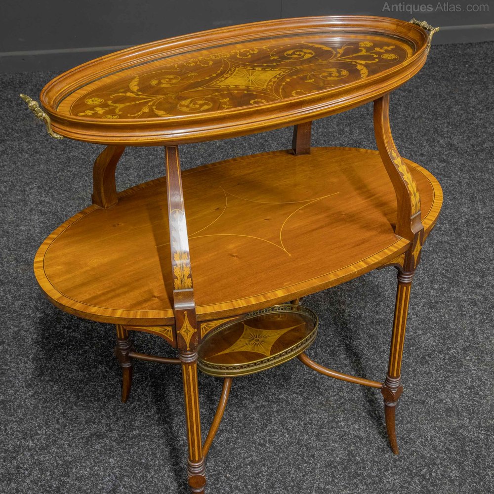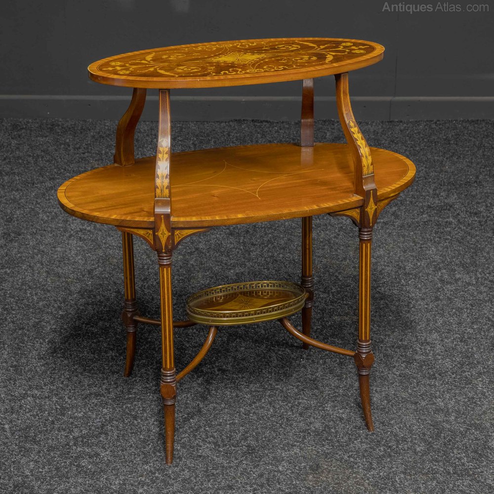 A highly decorative Edwardian inlaid mahogany etagere circa 1905. In super condition with very little fading and complete with the original tray top. The inlays and boxwood stringing are throughout this delightful piece of high end furniture, with the top being exceptional. Most likely from the Edwards and Roberts cabinet makers, it is certainly of that calibre. All cleaned and wax polished and ready to use and enjoy.Height - 86cm Depth - 47cm Width - 81cm