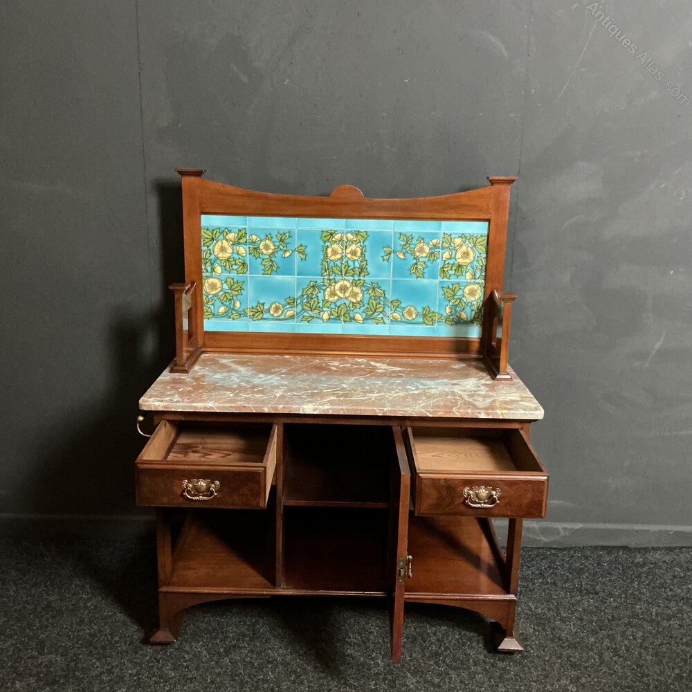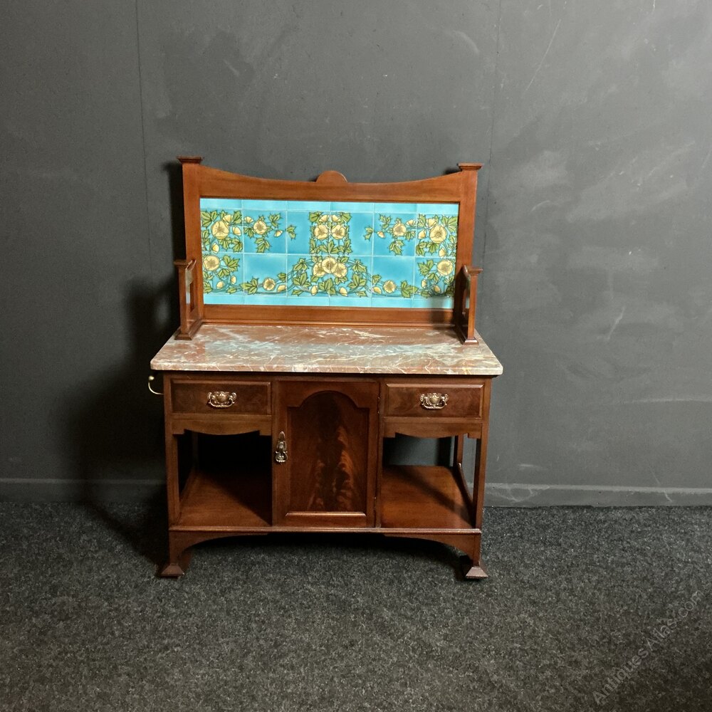 A striking Art Nouveau marble top washstand from the late Victorian period.The tiles are probably Minton and are most unusual with the turquoise backdrop to the flowers, foliage and seeded fruits. They have light crazing, only noticeable when close up . The high quality marble top is a mixture of pinks, greys, whites and salmon. With no cracks or chips.Th base is of typical design and made from solid Mahogany. The handles, castors and towel rail are all original. The whole piece is of high quality and in very good condition throughout. Our washstands are finding new uses in the home and businesses always popular for drinks cabinets with the marble top an ideal durable surface. SKU-G7Free UK mainland delivery on this piece.