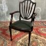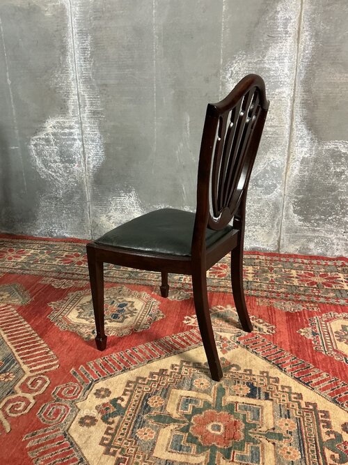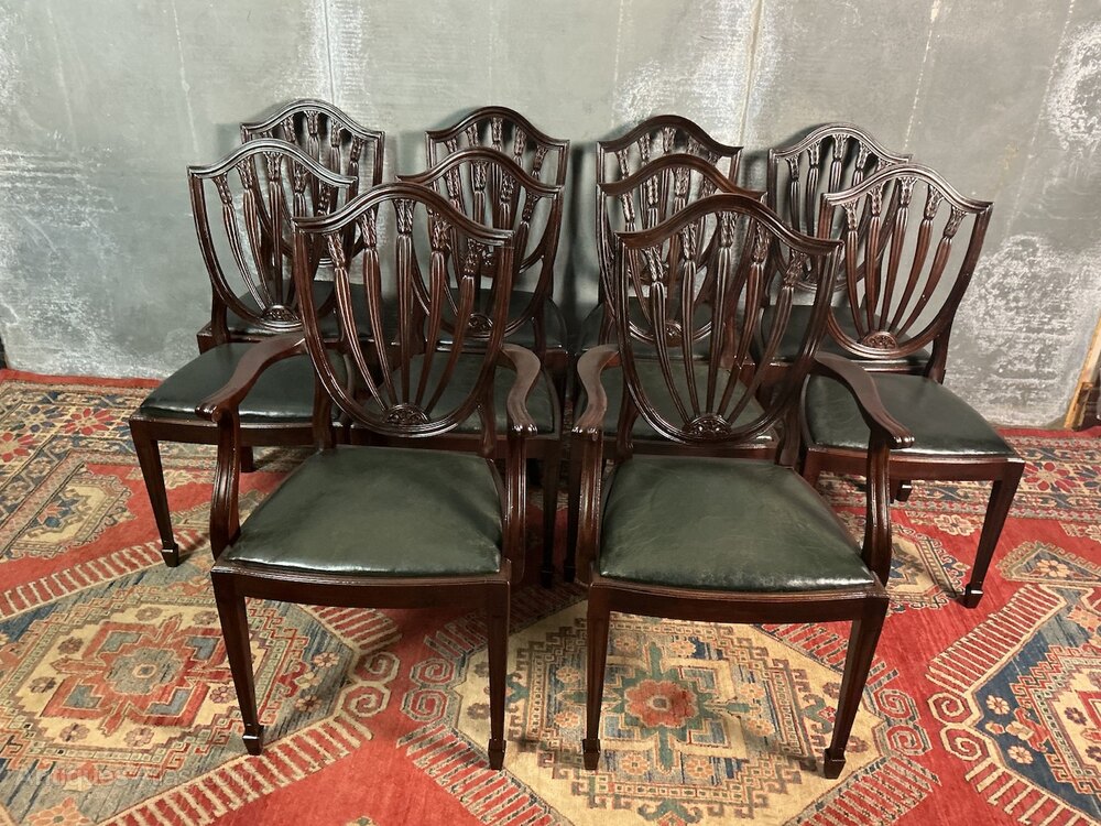 A quality set of 10 (8+2) dark Mahogany chairs in the George Hepplewhite manner. Edwardian circa 1905. Recently re polished and really nice to see the original green leather seats in such good order for their 120 years. All good and sturdy not to be confused with most later reproductions. Ready to use and enjoy. SKU-G23Free UK mainland delivery on this piece.