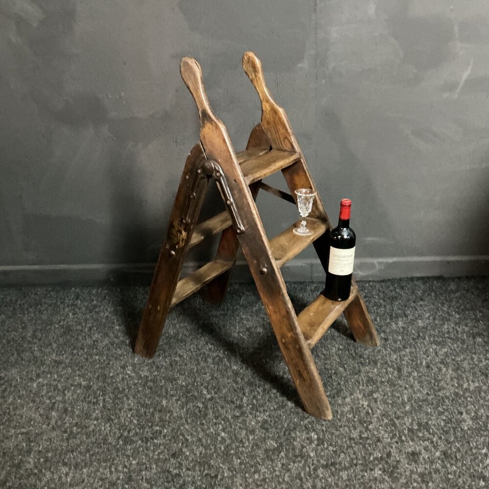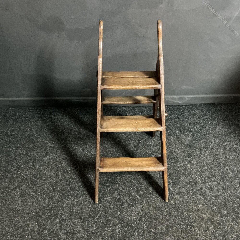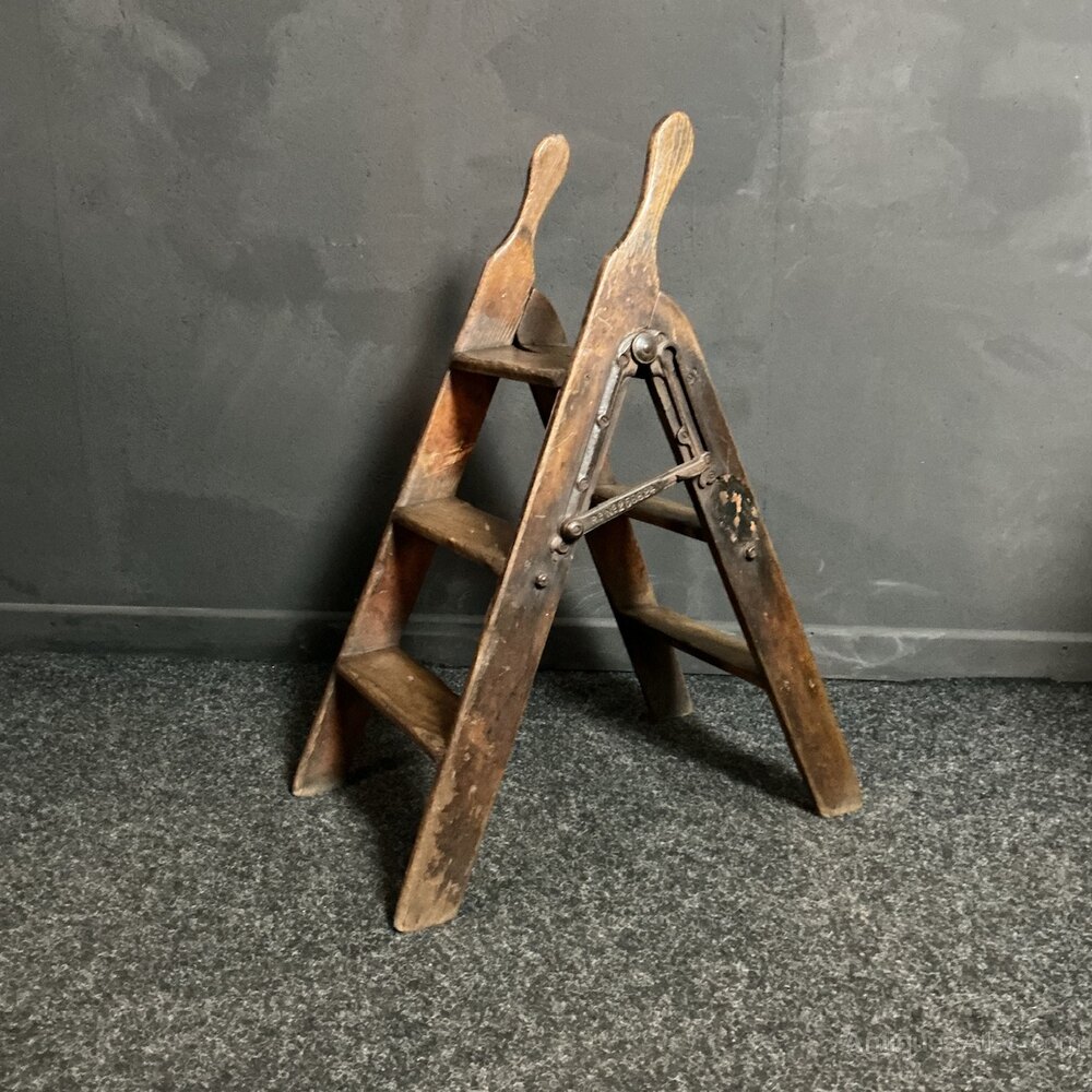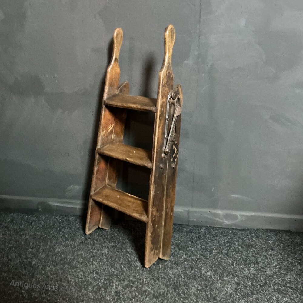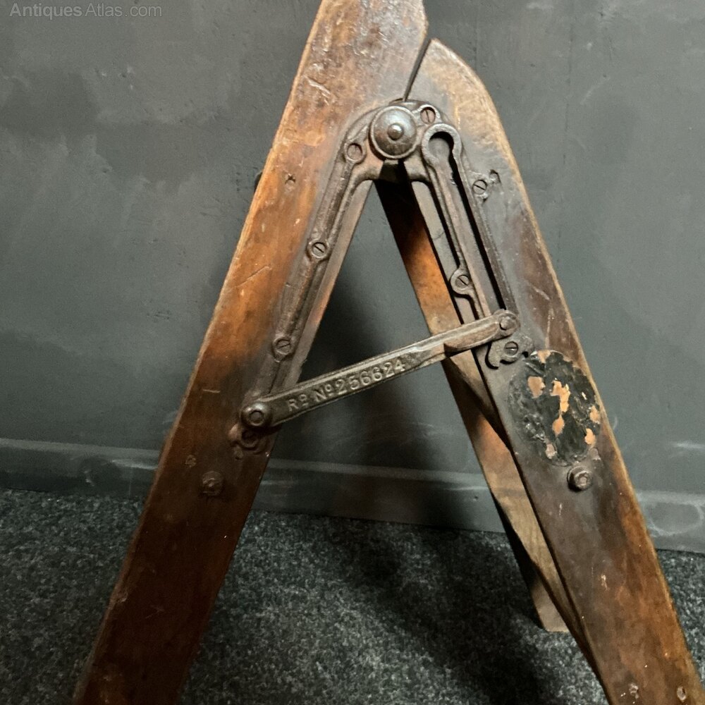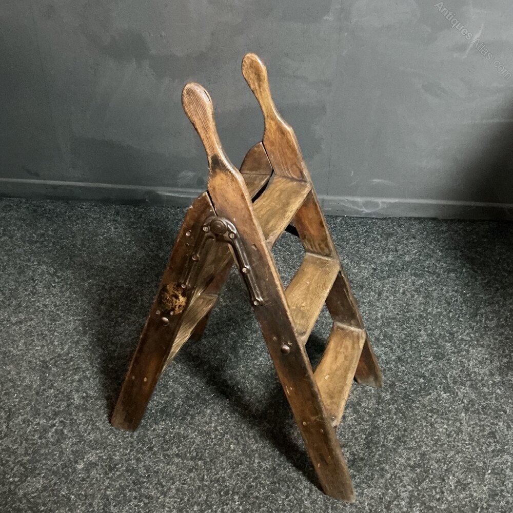 Antique Shop Ladders from the late Victorian period circa 1890. This model of ladders are usually associated with the retail trade and are in good original condition. Made from Pine with cast iron locking hinges which still retain the registration number. All very sound but with health and safety issues of today they are very popular for decorative purposes.SKU-G32