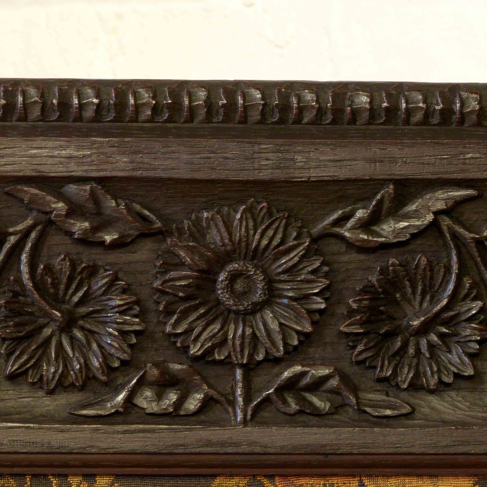 This is a fine Victorian screen with both sides of the frame smothered in carving. The rear is of a light foliate nature whilst the carving to the front is crisper and heavier with more detail, especially the bursting sunflowers. The inner tapestry panels are also of a botanical nature and are slightly faded but given their age you would have to say in good condition with no holes or tears. (These panels are fixed in with simple beading and could be changed if you felt the need. Personally I wouldn't) This is a highly decorative piece that will look fantastic in the right situ. Hand waxed and polished ready to enjoy.Free UK mainland delivery on this piece.