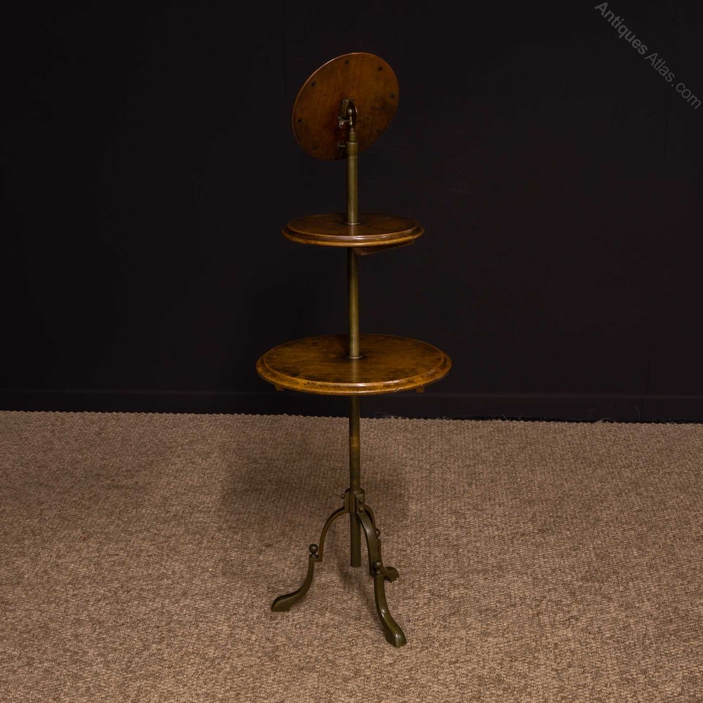 A wonderful Edwardian Gentlemen's shaving stand. The legs and telescopic central column are brass foil on solid steel and the two shelves are solid walnut. The bevelled round mirror has a very unusual feature being a combination of walnut with a brass bezel, this too is adjustable on the rake. This piece is in very untouched original order complete with old water marks on the walnut and the authentic antique finish to the brass. Great solid condition with only an old repair on the column fixing the loose brass foil in place.H165cm x D46cm x W46cm