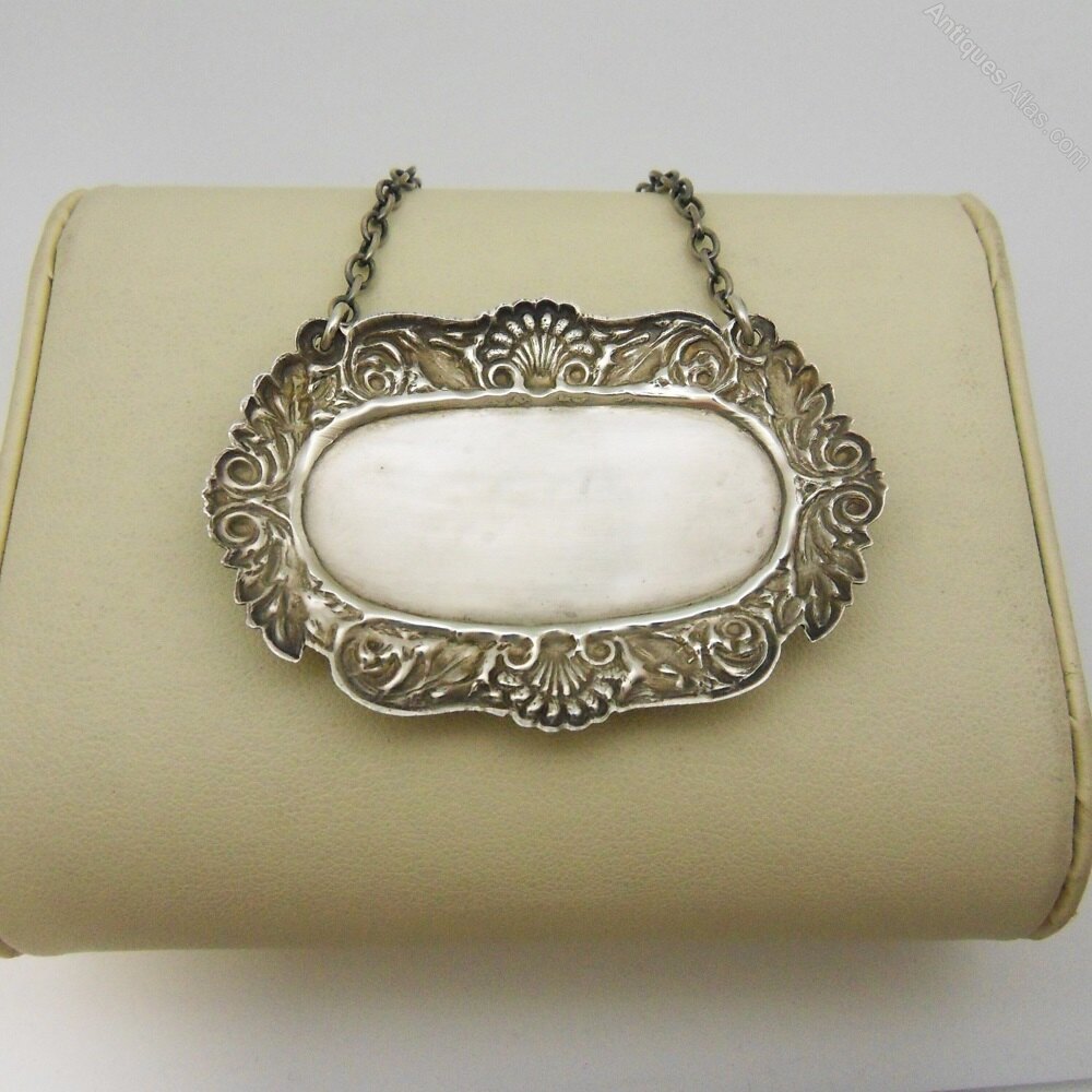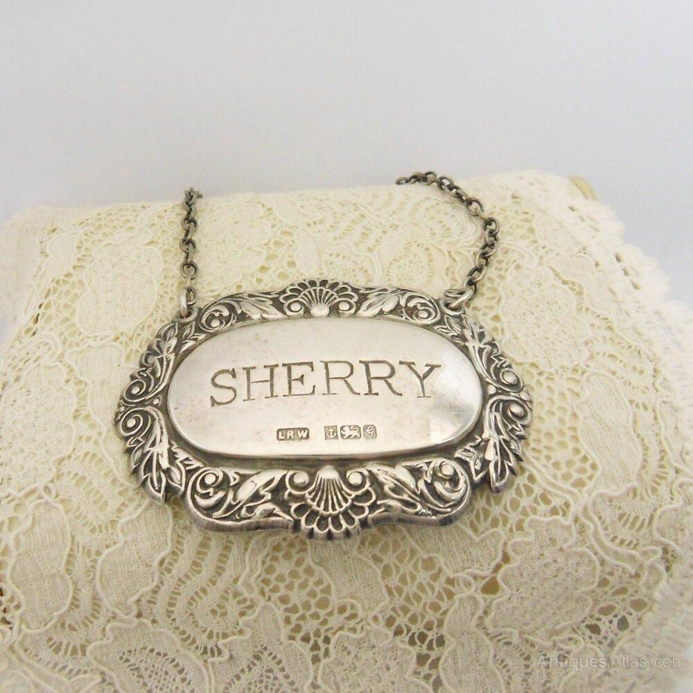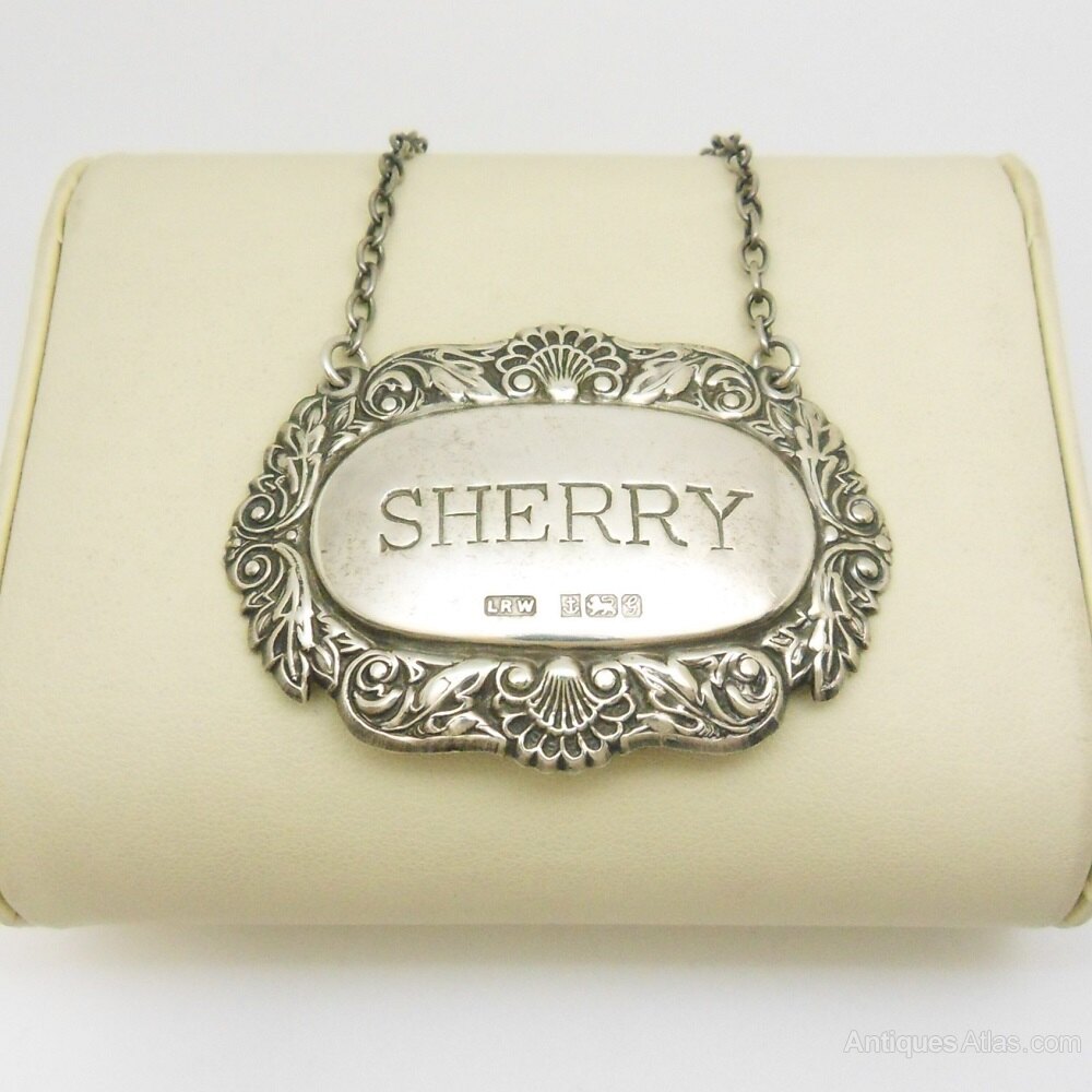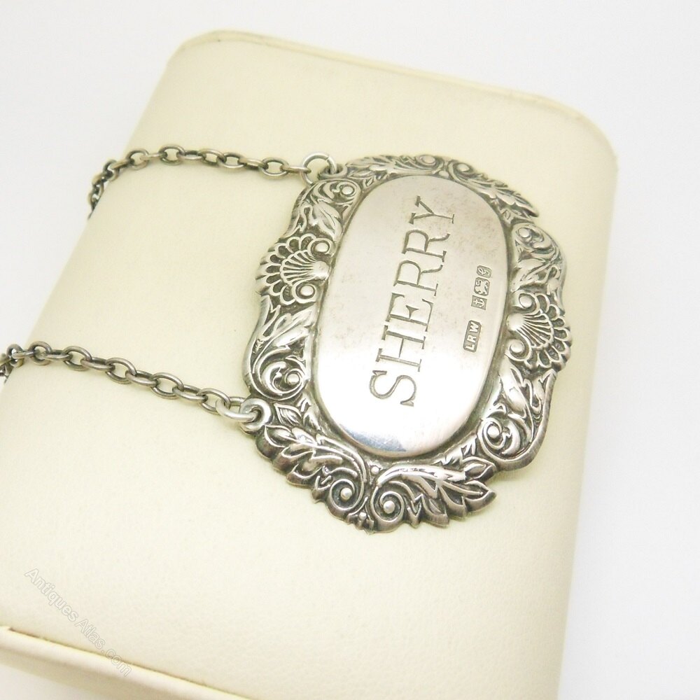 A classically styled sherry label, with the word 'SHERRY' boldly engraved on a smooth cartouche with an attractive decorative border of ornate leaves and shell motifs.Hallmarked clearly on the front as sterling silver, Birmingham 1981 with makers initials for Laurence R Watson & Co. The label hangs from a simple 6" long silver chain.