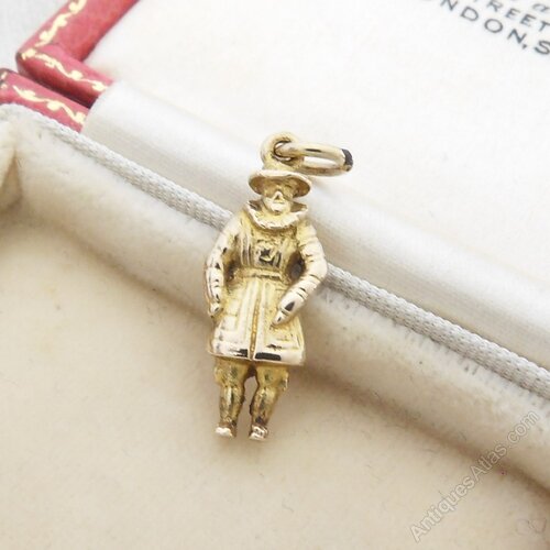 A nicely detailed vintage 9ct gold charm / pendant in the form of a Beefeater. Hallmarks are visible for 9ct gold, Birmingham 1952 and there is a loop at the top for attachment.In great condition.