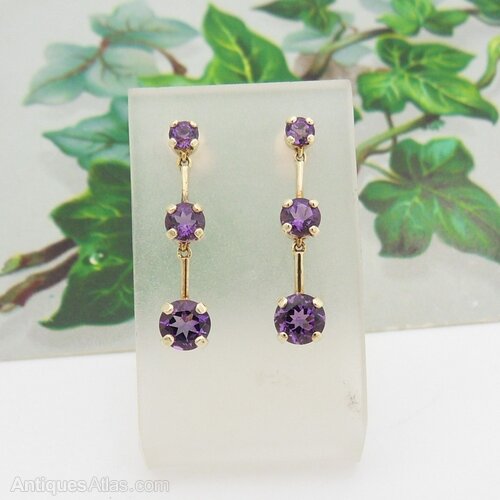 Vintage 9ct Gold 3 Stone Amethyst Drop Earrings
