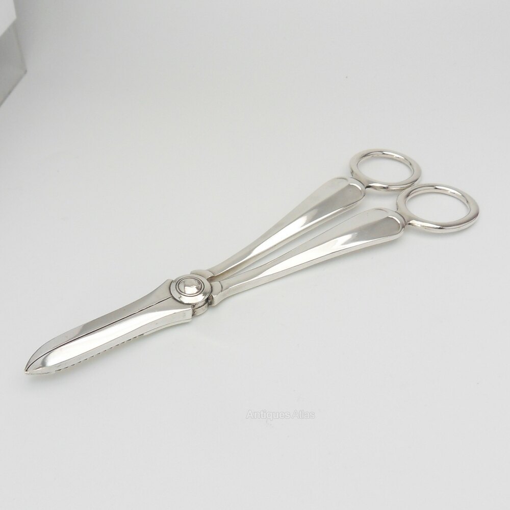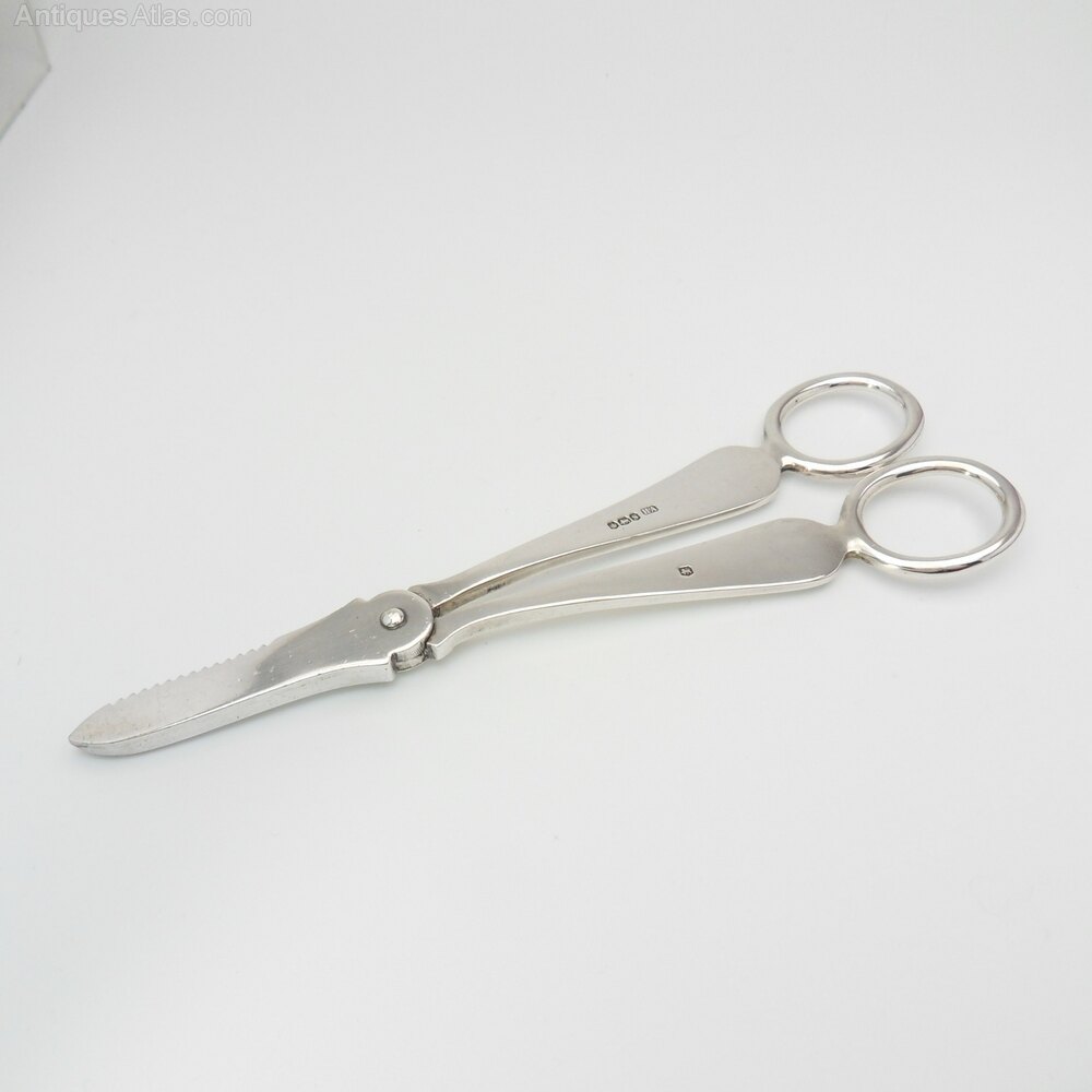 Pair of elegant silver grape scissors hallmarked Sheffield 1935 Atkin BrothersA lovely, functional piece of tableware that are very tactile & in very good vintage condition. They are simple, polished silver with only slight detailing to the front. To the back of the grape scissors are hallmarks for the Sheffield assay office and date mark for 1935 by Atkin Brothers. Inside, the cutting edge to one side is serrated to help cut through grape stalks.