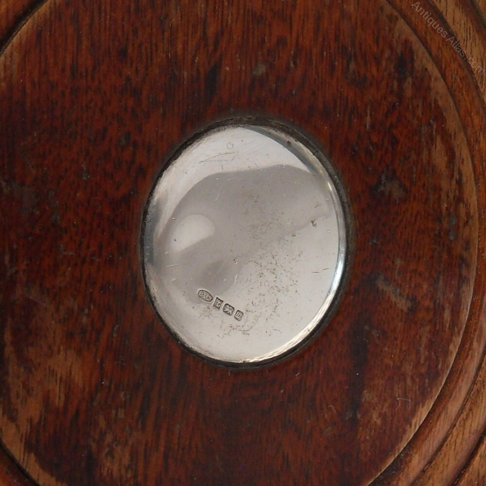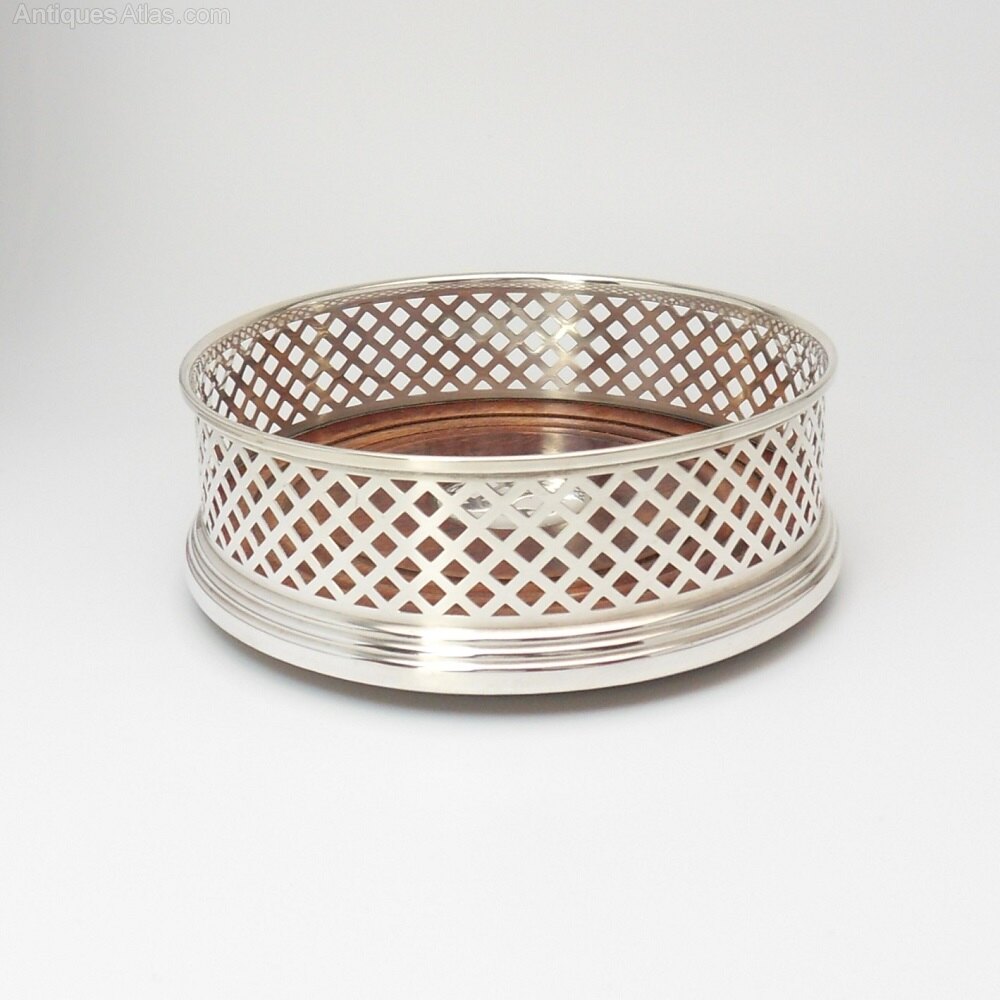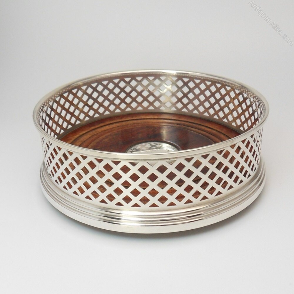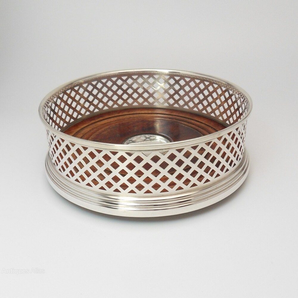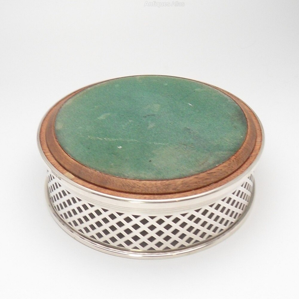 A delightful silver bottle coaster with lovely wooden base. Large size measuring 12.6 cm across the base. The silver is a pretty pierced trellis design, attached to a neat protruding base. On one side of the base are the clear hallmarks for the Birmingham Assay Office with a date mark for 1996 and silver maker's mark: W I Broadway & Co. There is also a hallmarked silver disc in the centre of the wooden base. The underside is covered in a green baize.Lovely coaster would grace any dining table setting & would be a great gift for any occasion!