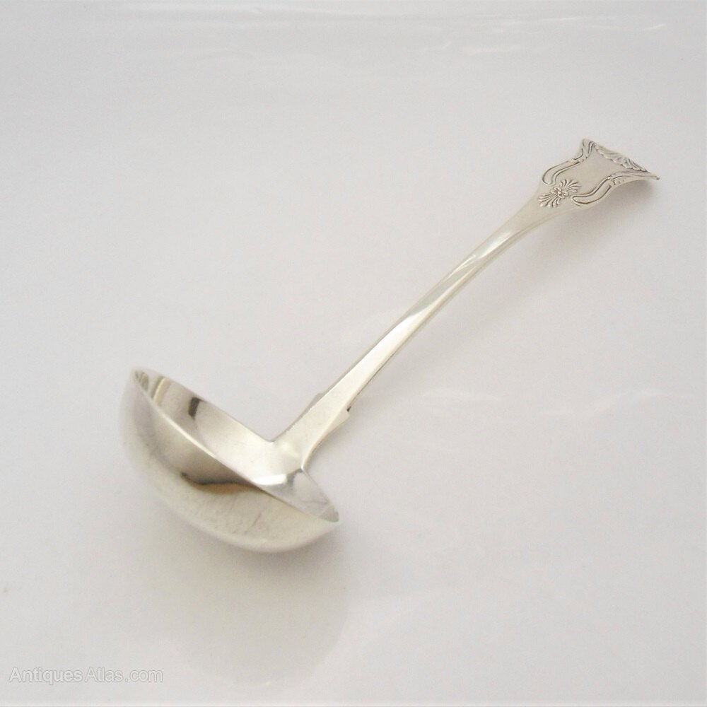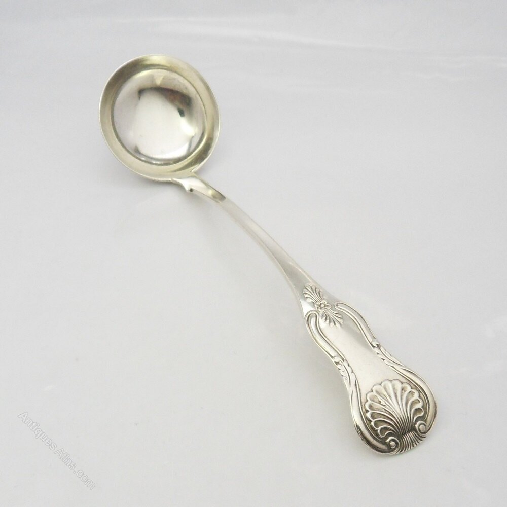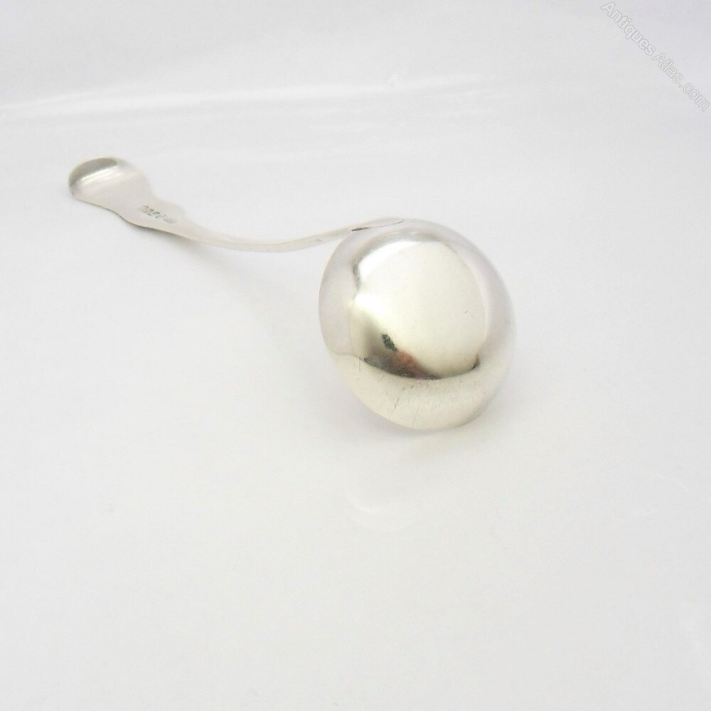 Antique silver sauce ladle with a smooth handle and bowl and a scallop detail to the handle. The moderate size makes it most suitable for sauces or maybe fruit compotes. Very clearly hallmarked with date marks for Glasgow assay office 1827 and makers mark for William Russell. In great antique condition with just light surface marks to the bowl, commensurate with age.This would make a beautiful and useful wedding gift, and a lovely addition to any formal dining table.