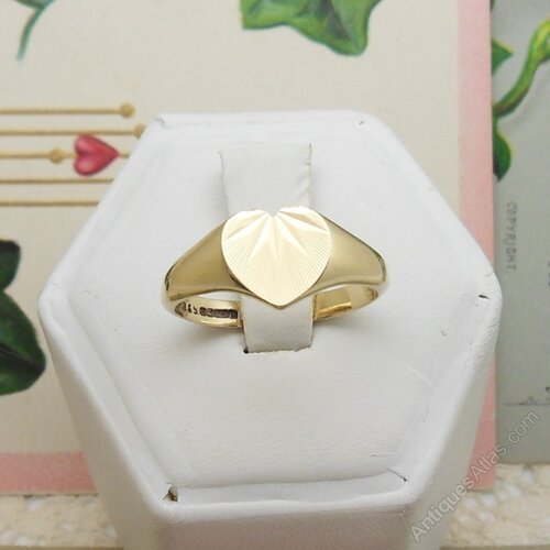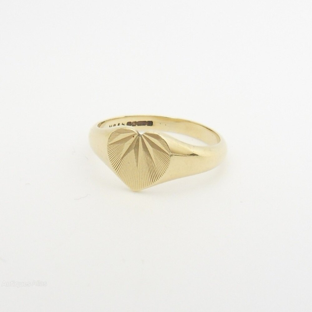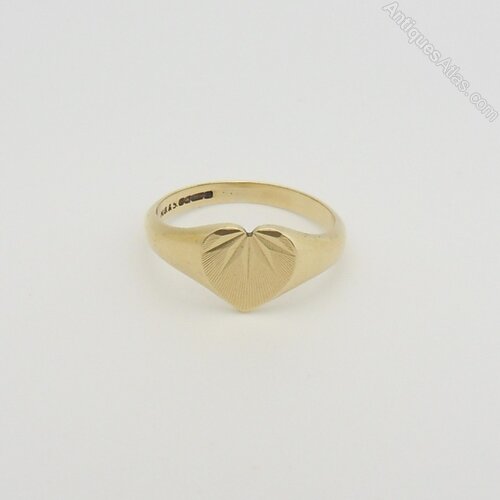 A vintage 9ct gold heart shaped ring with a simple yet elegant style.The centre is heart shaped with diamond cut decorations, like starbursts which catch the light beautifully. The rest of the ring is polished gold which gradually tapers towards the back.