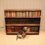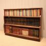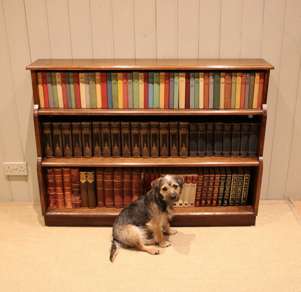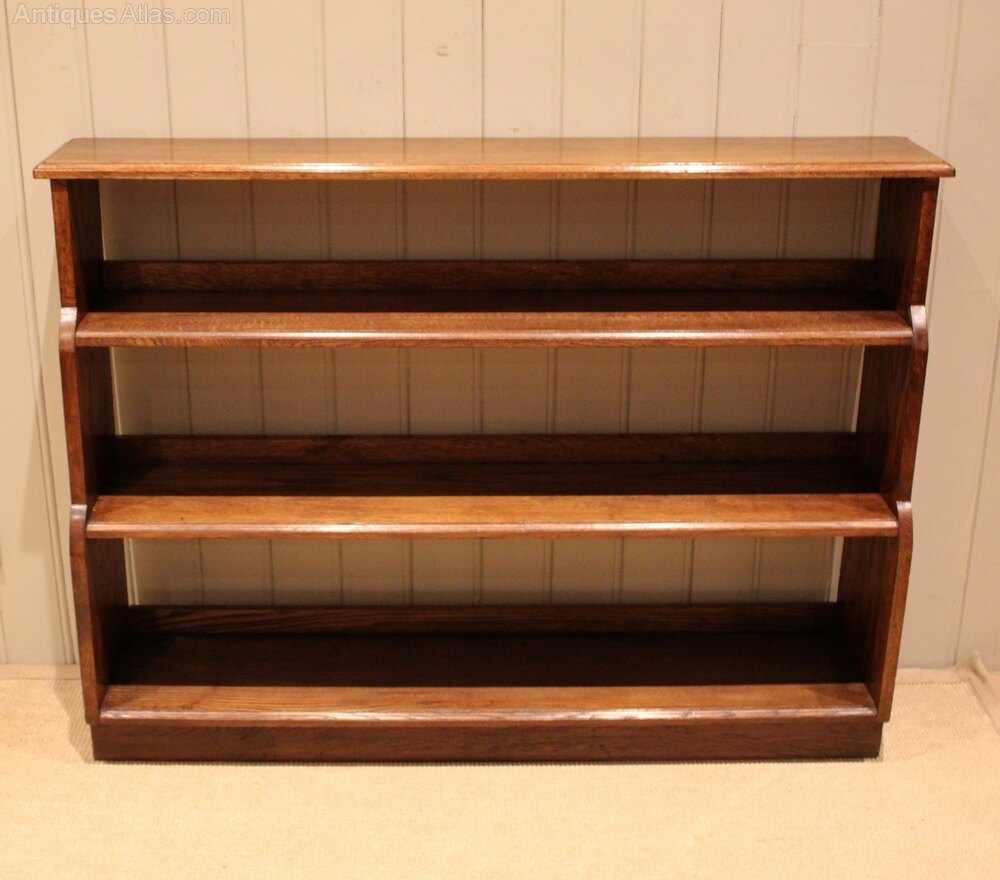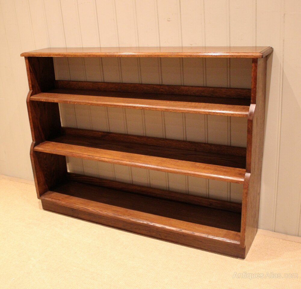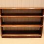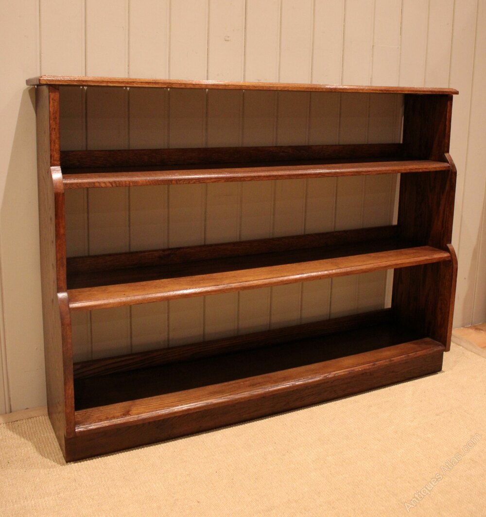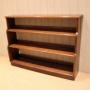 Solid oak open stepped bookcase having three fixed stepped shelves , raised on a plinth base . The shelf dimensions are 115 cm wide and from the bottom up 27.5 cm high x 24 cm deep , 25 cm high x 22 cm deep and at the top 20.5 cm high x 19 cm deep .Height