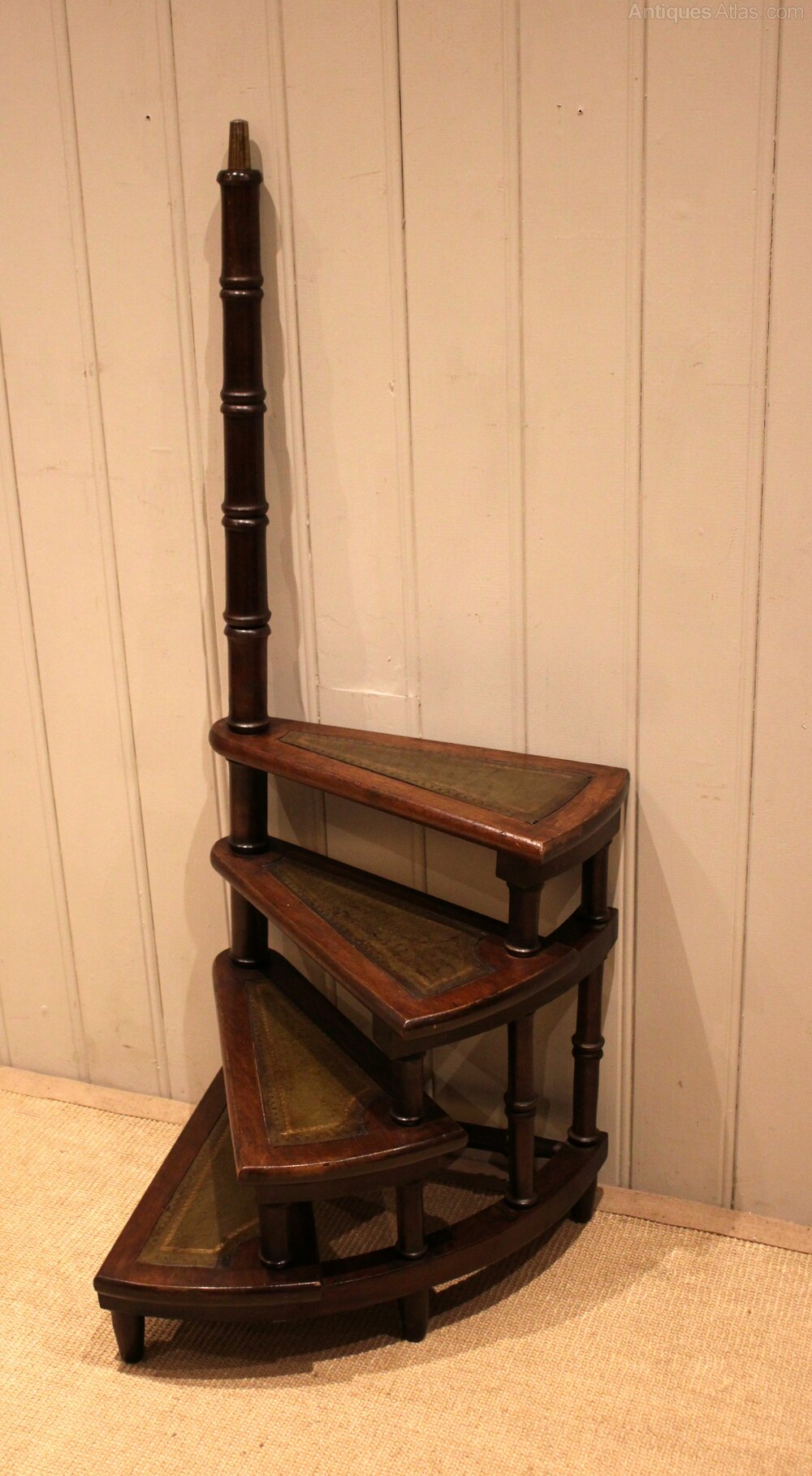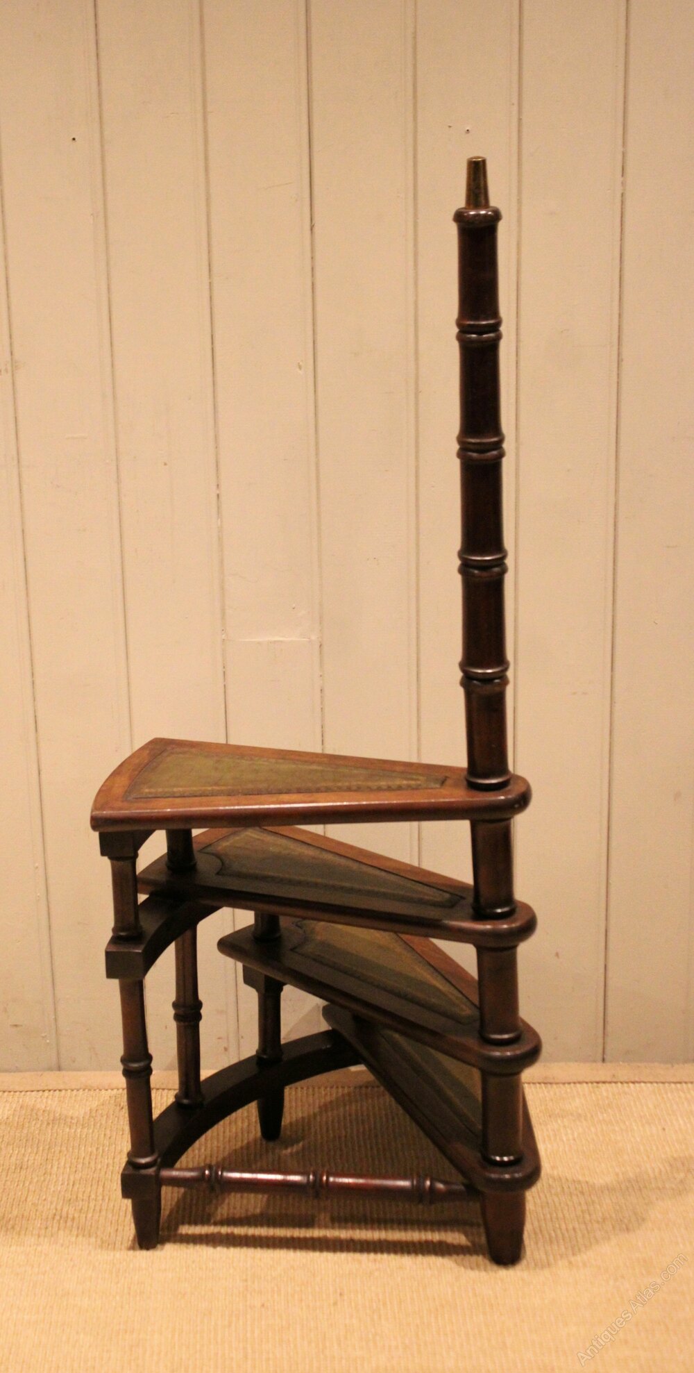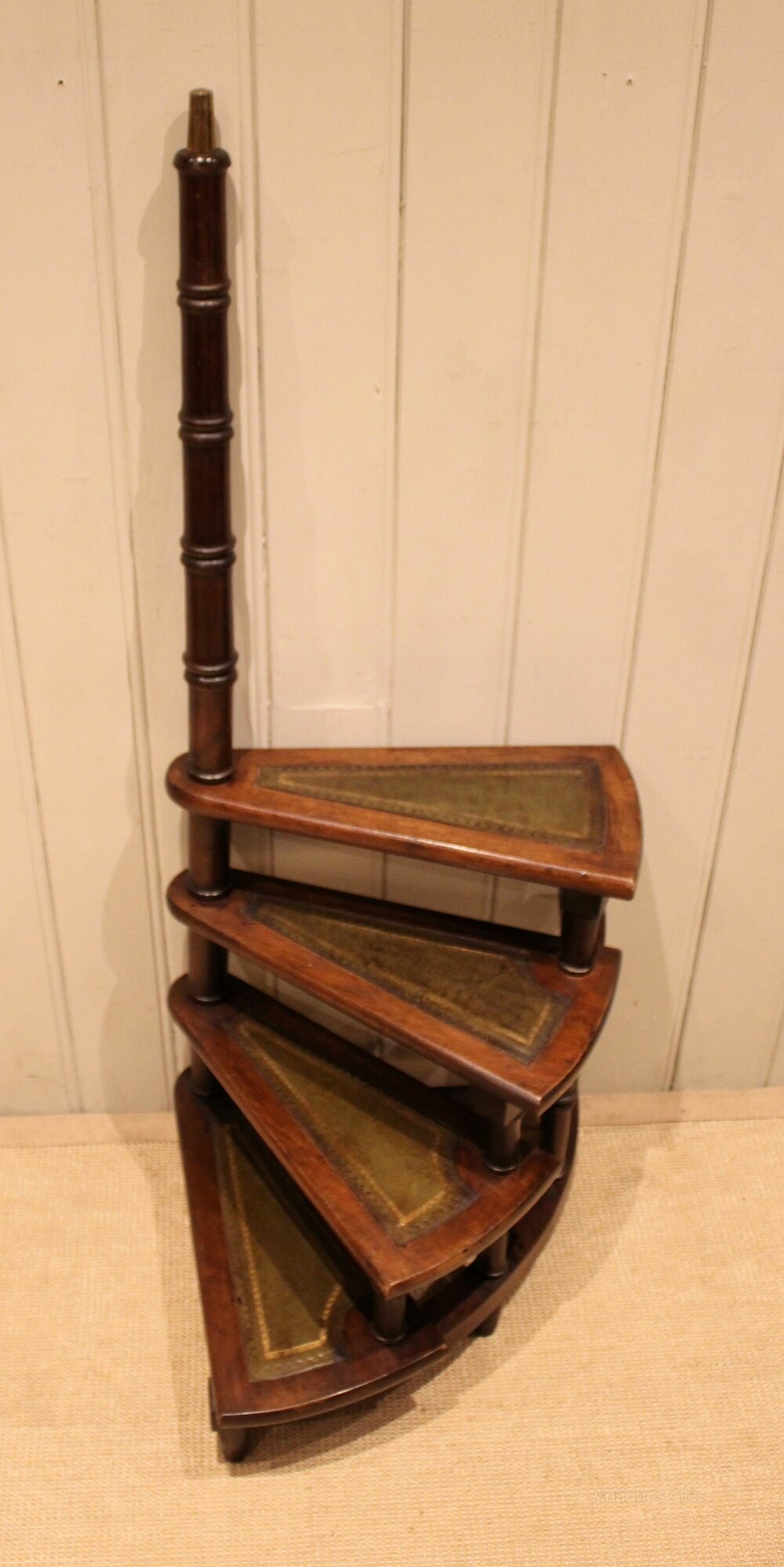 Mahogany library steps having a spiral formation with inset green leather treads , on turned supports .Height