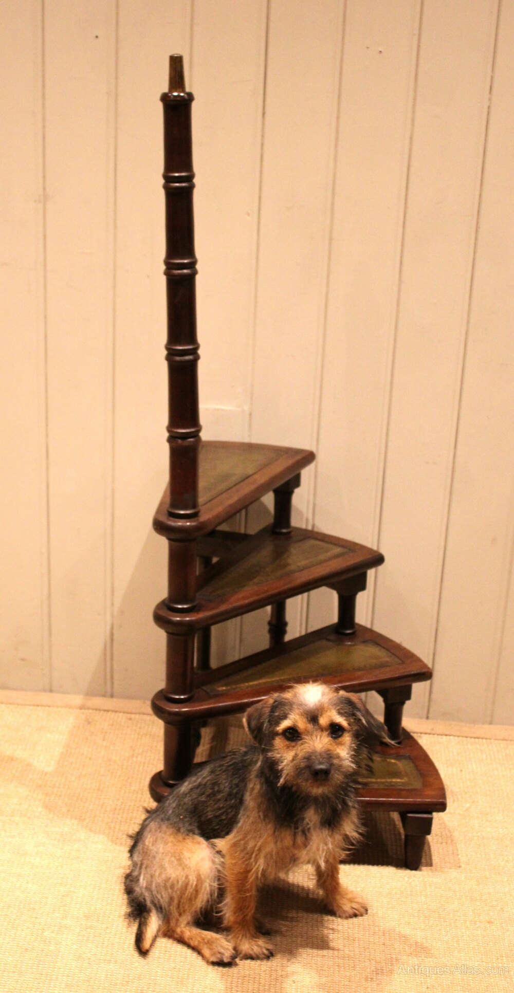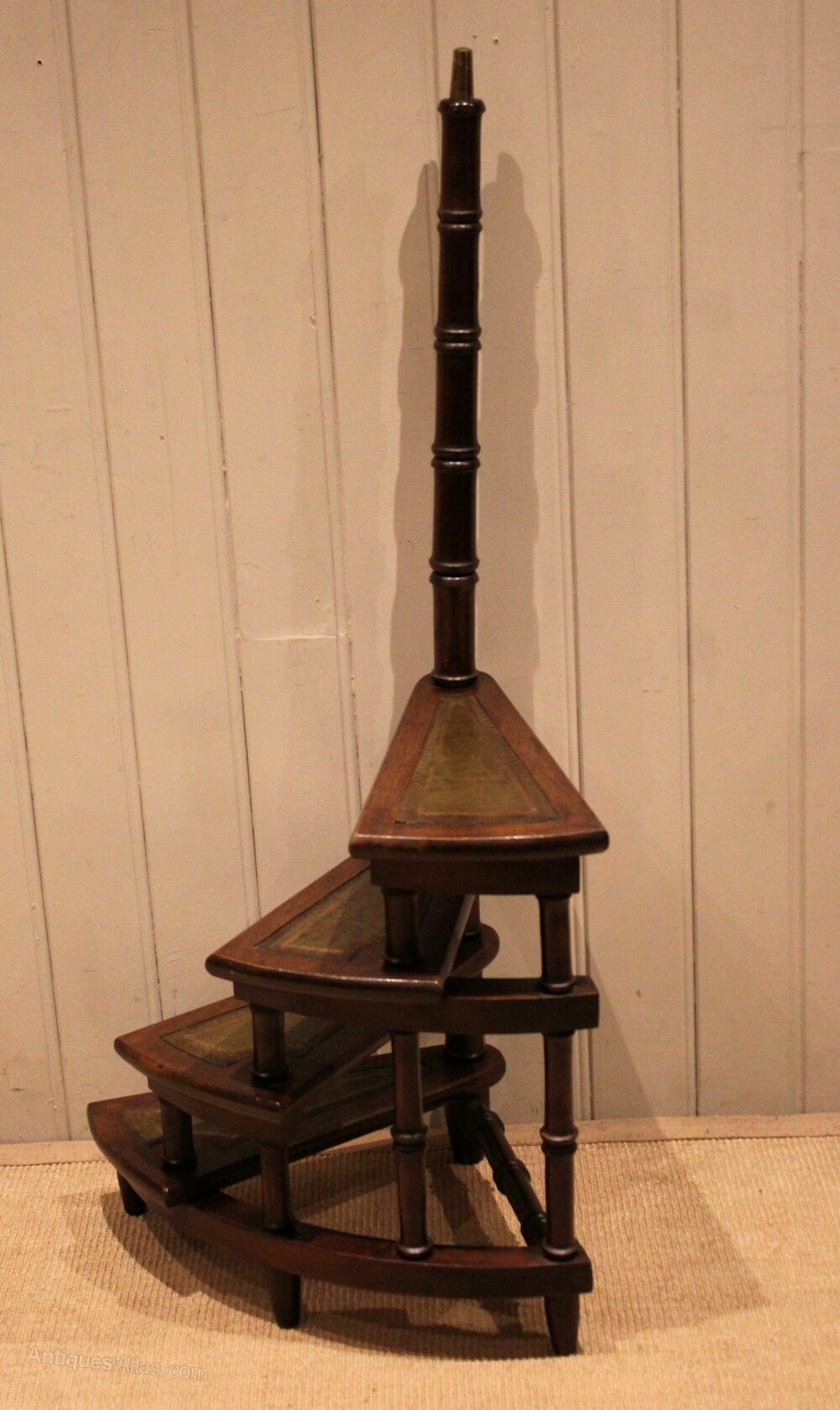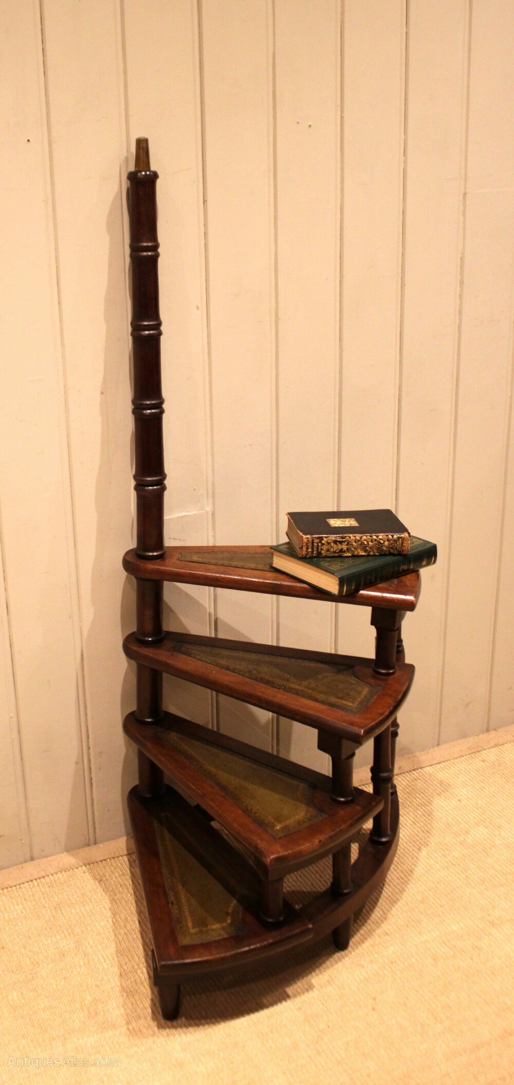 Mahogany library steps having a spiral formation with inset green leather treads , on turned supports .Height