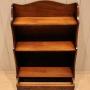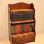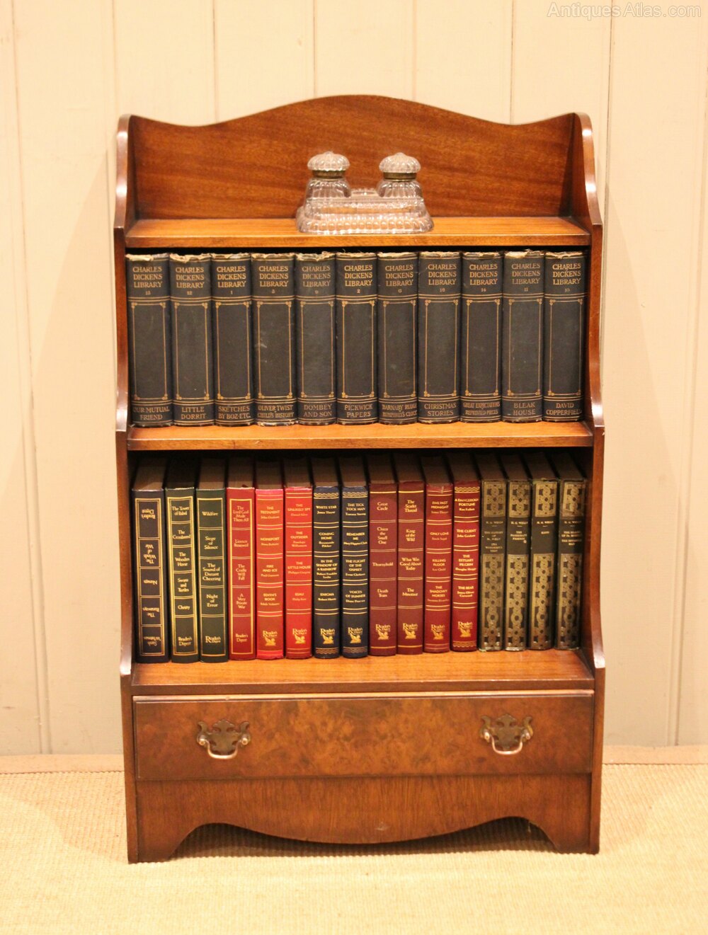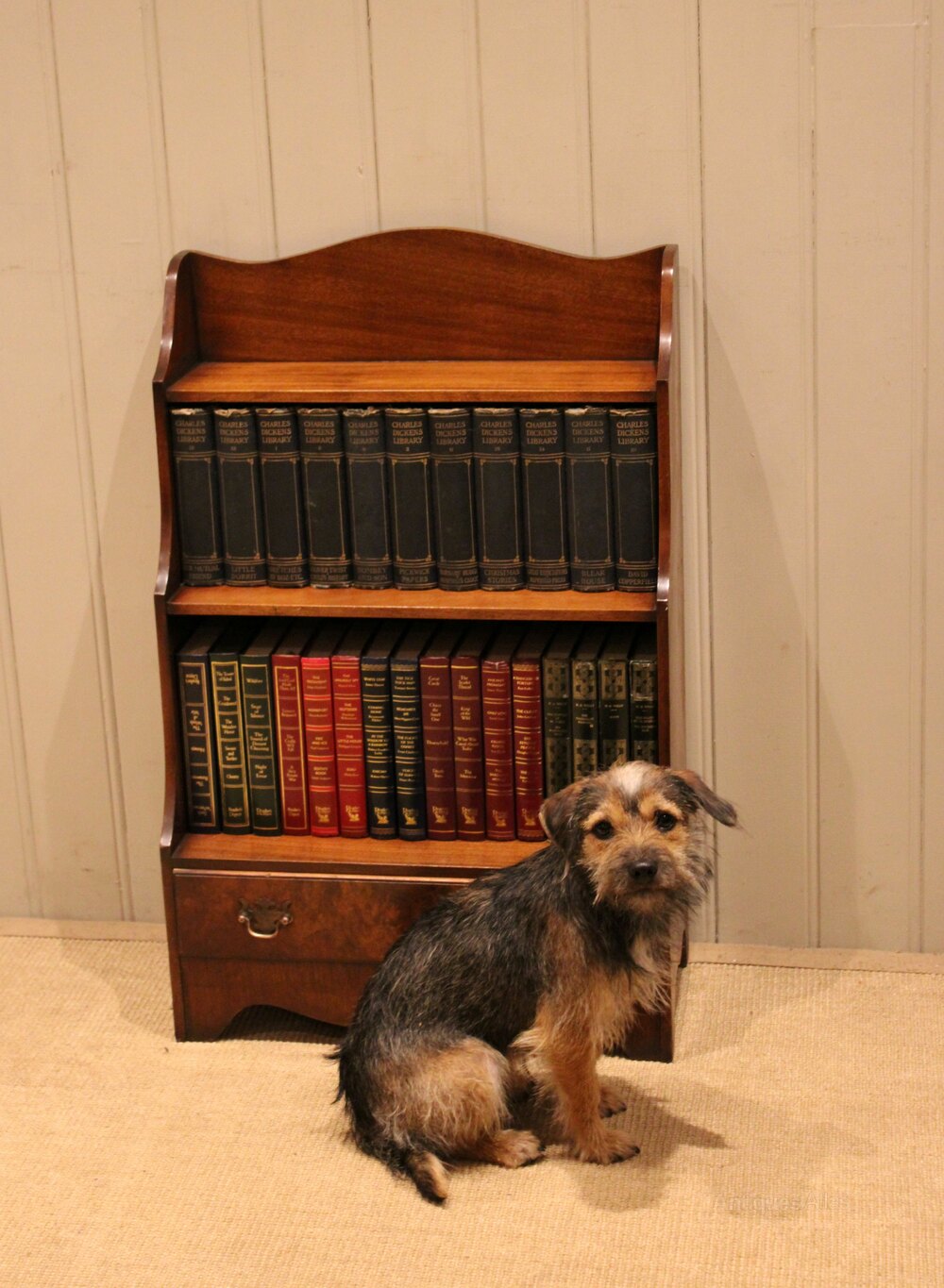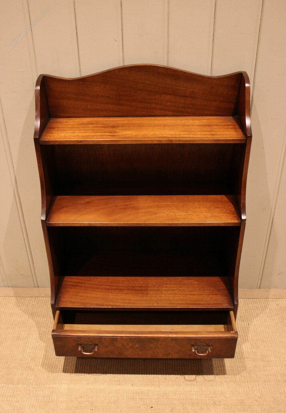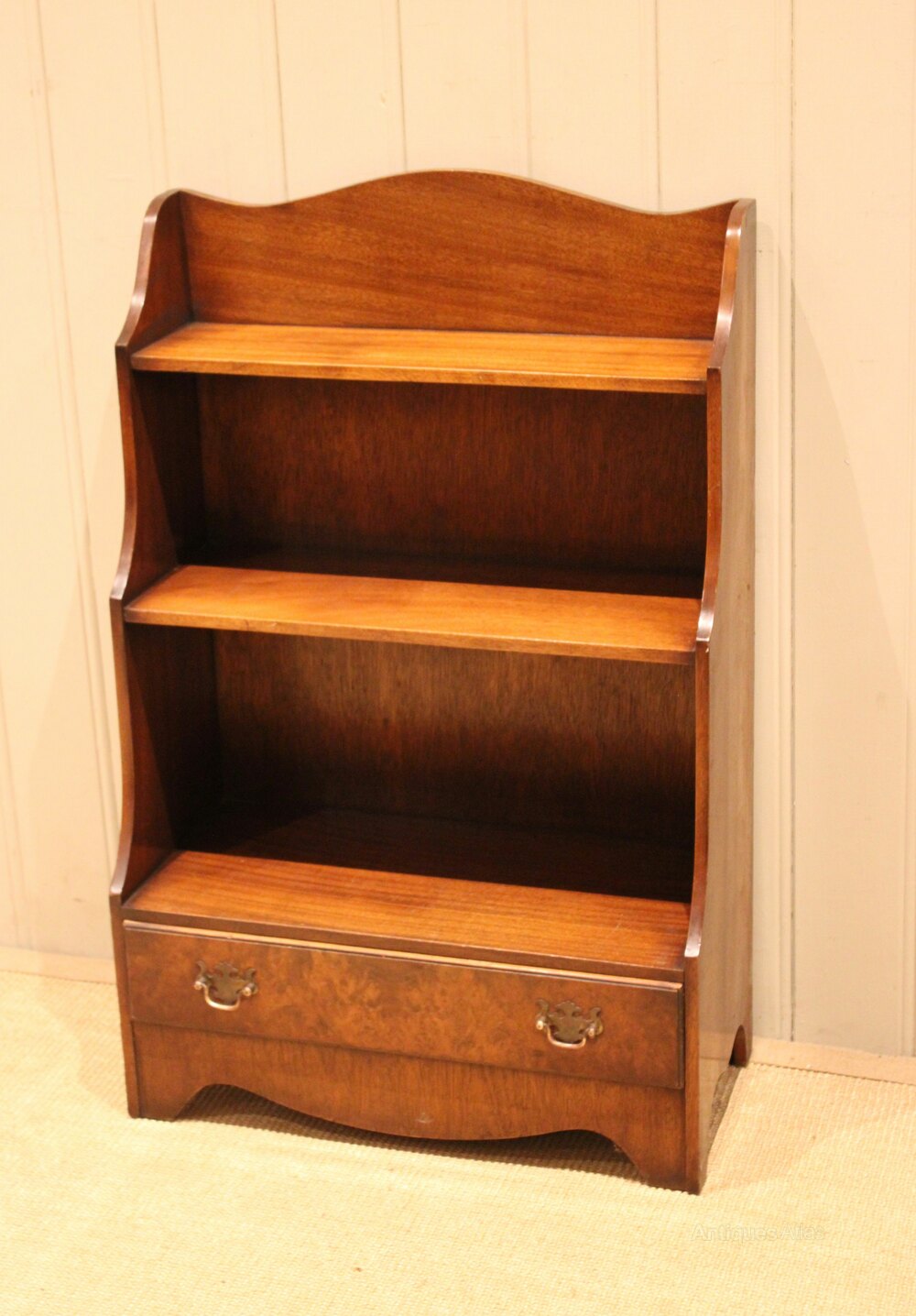 Small open mahogany and burr walnut bookcase having three fixed shelves above a burr walnut drawer to the base , raised on bracket feet . The shelf dimensions are 50.5 cm wide , and from the botton up 25 cm highx 24.5 cm deep and 20 cm high x 19 cm deep .Height