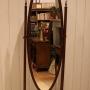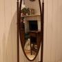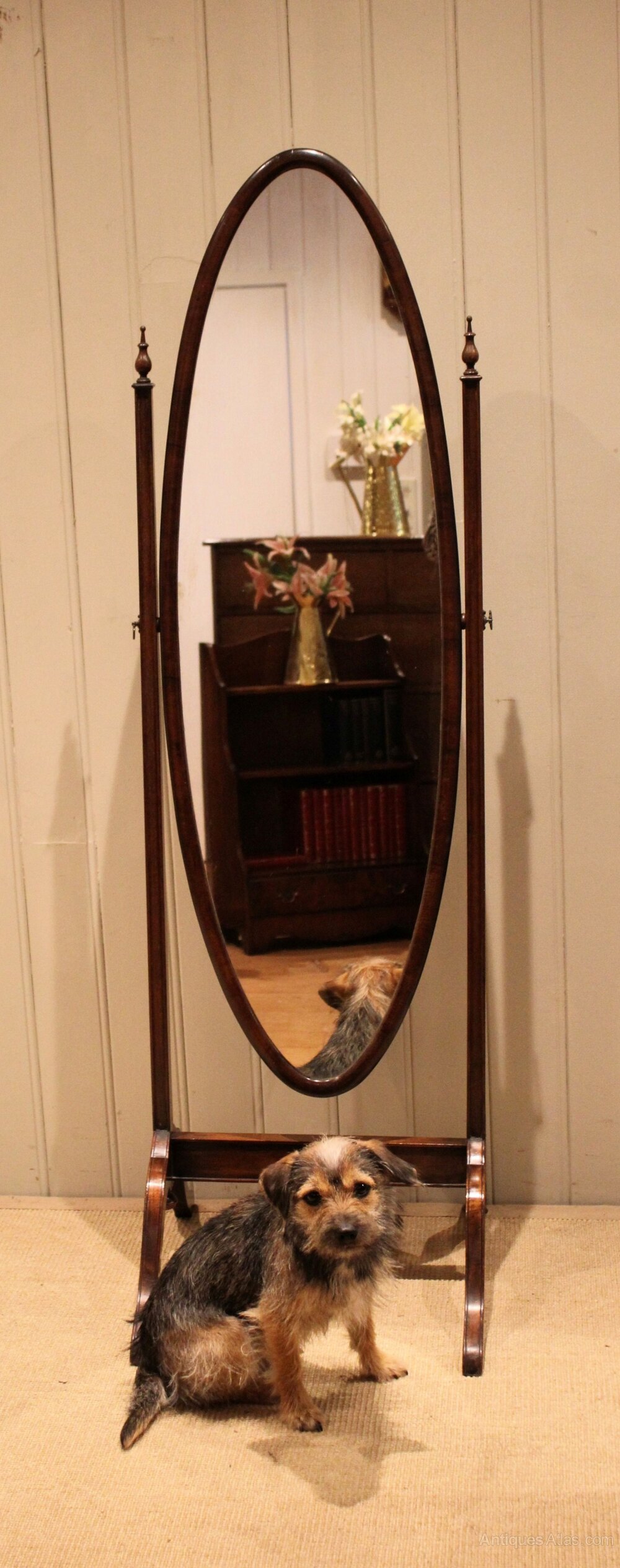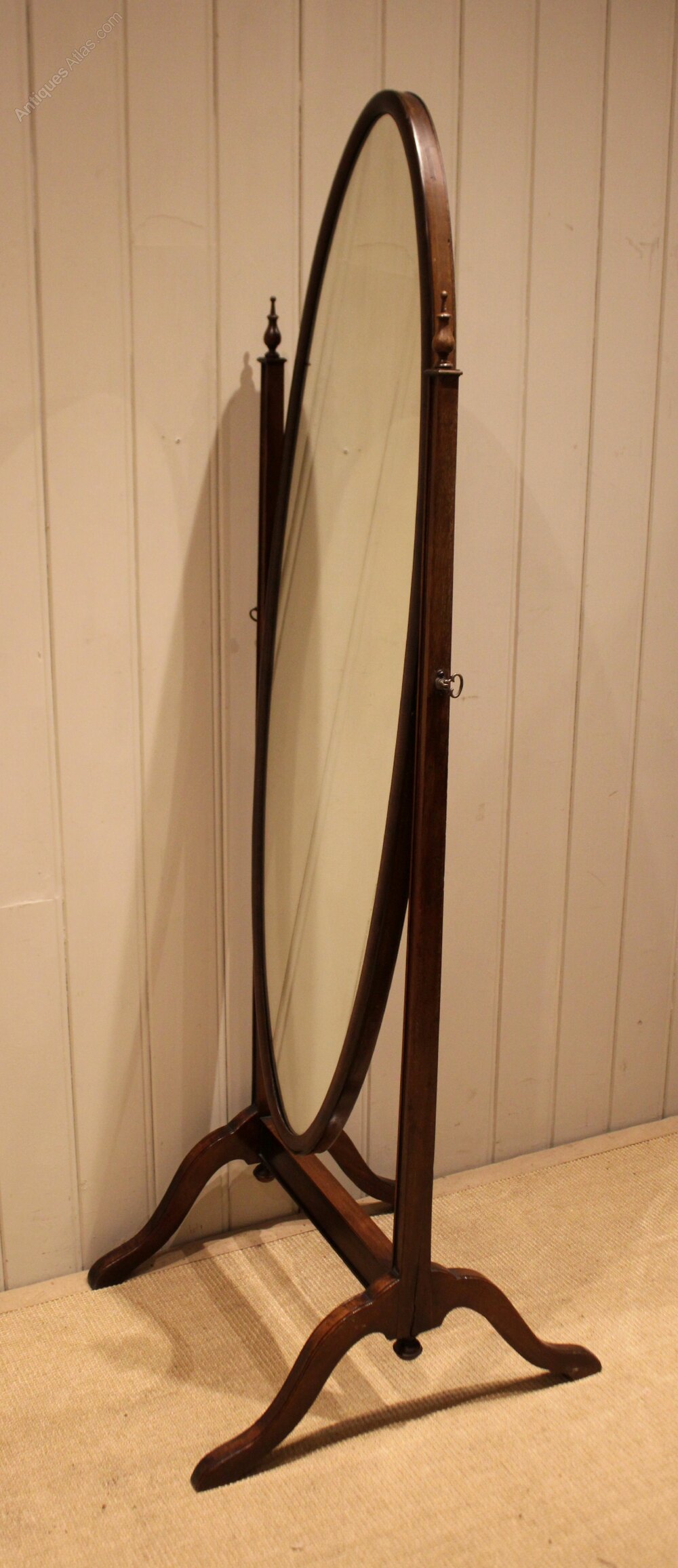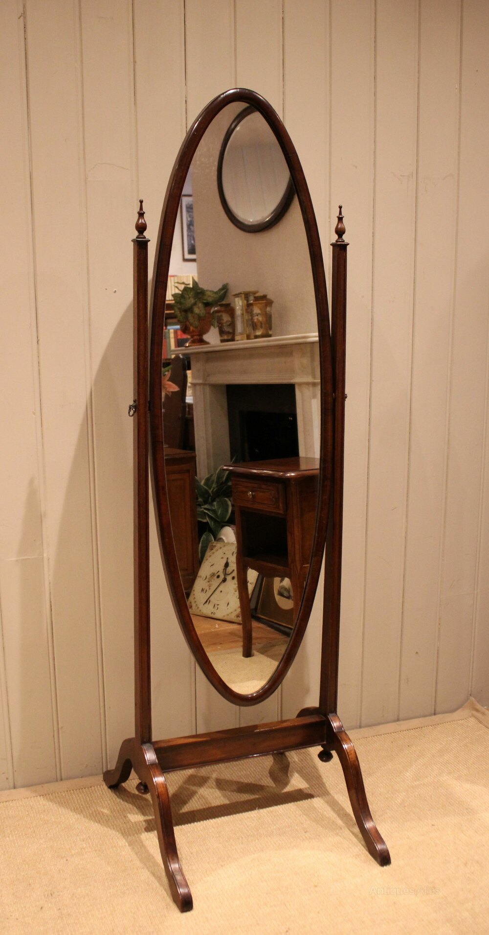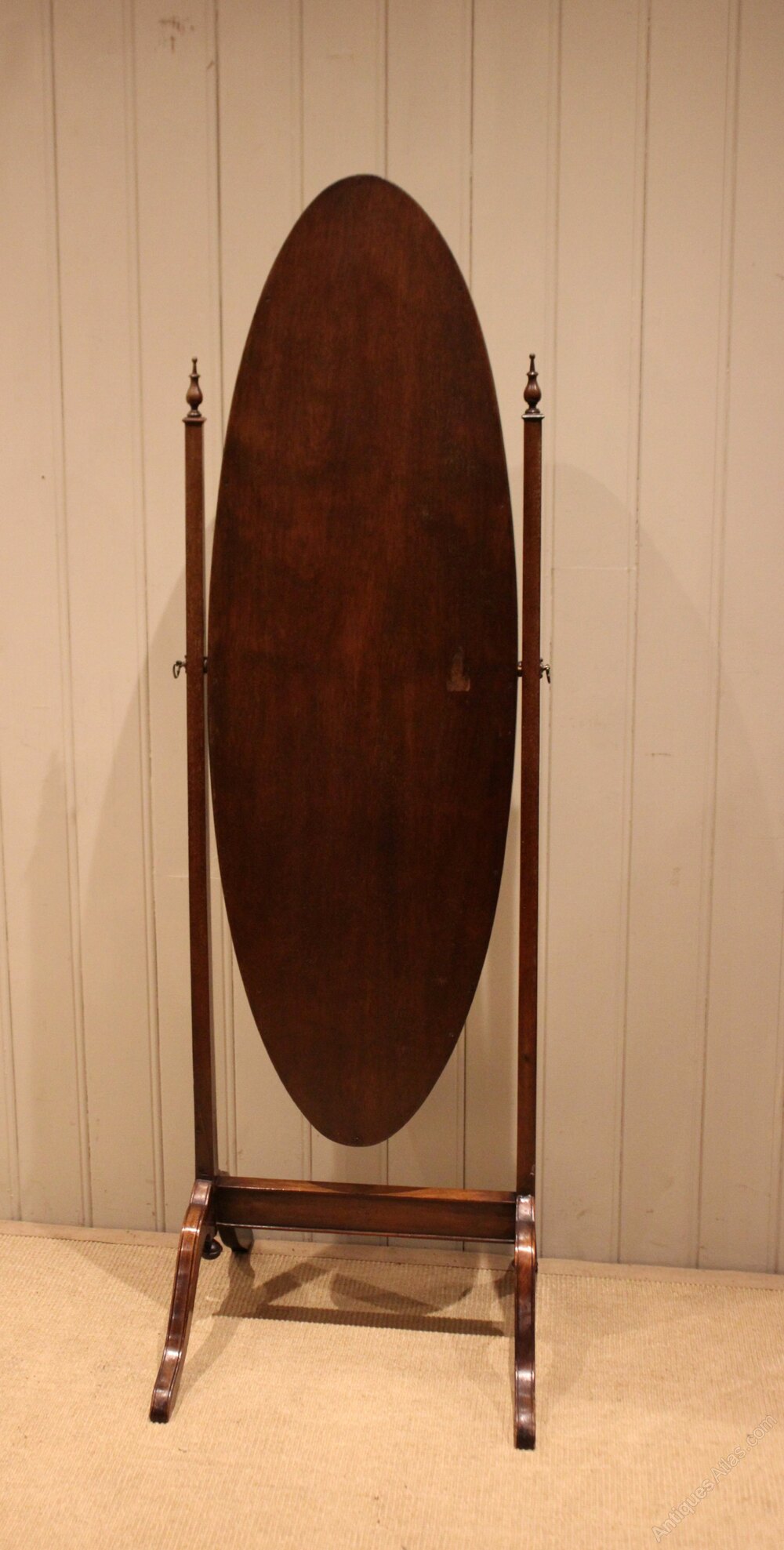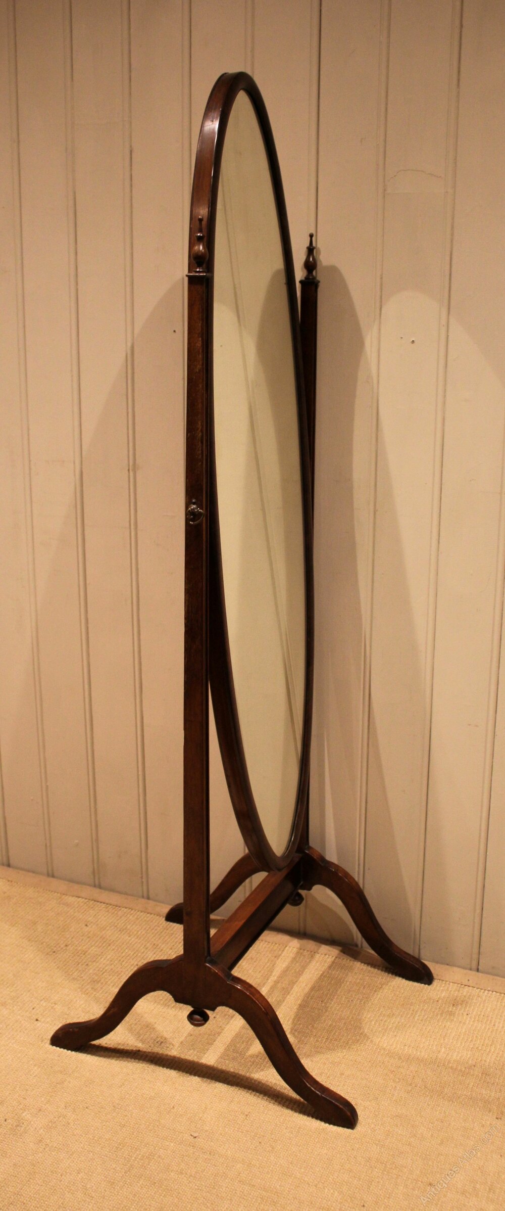 Oval mirror set in a mahogany frame with turned wooden finials and brass handles , raised on out splayed legs .Height