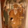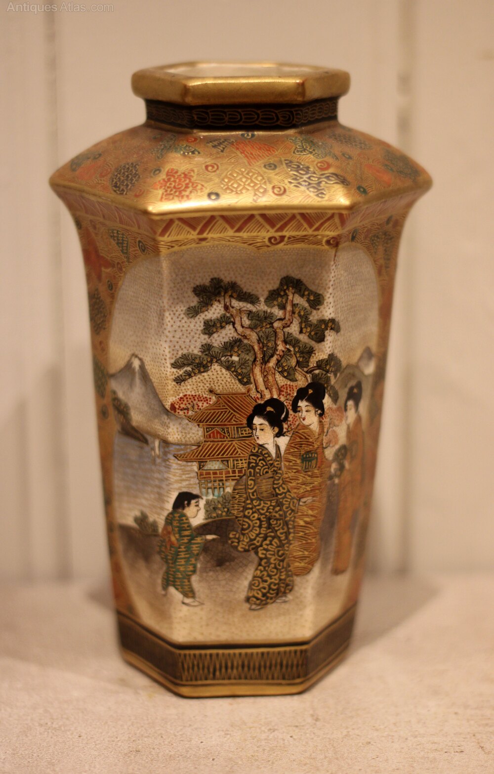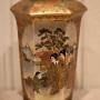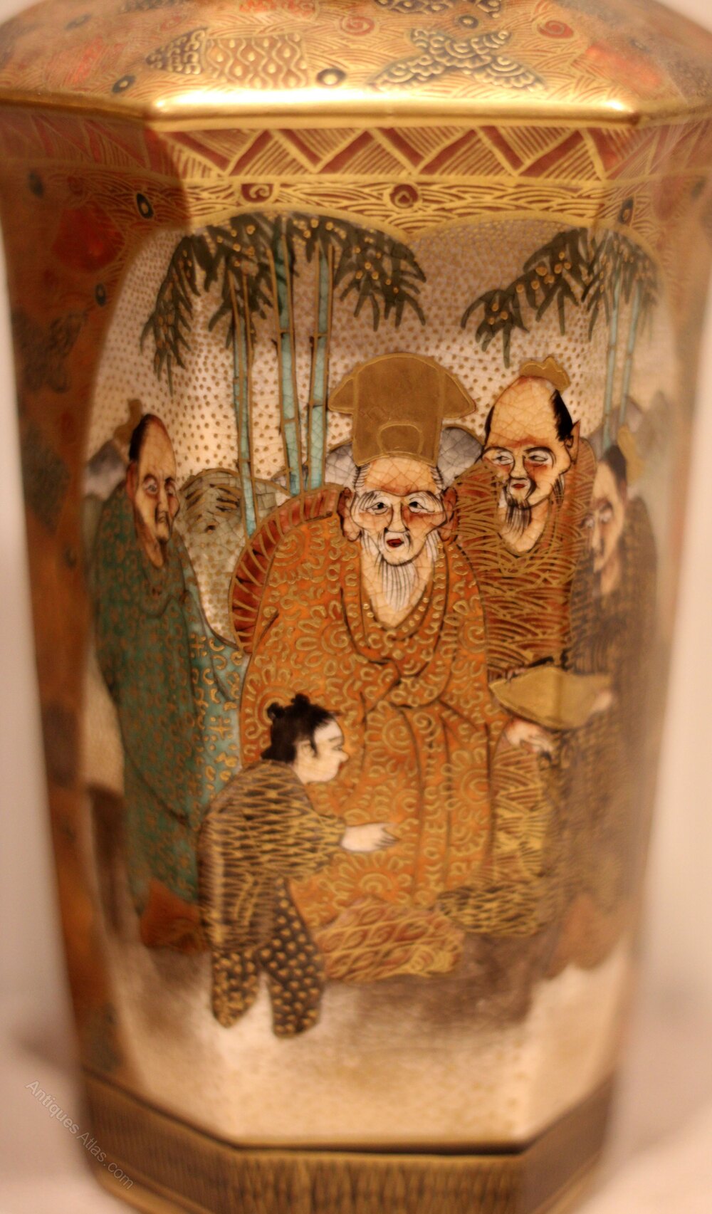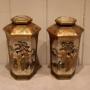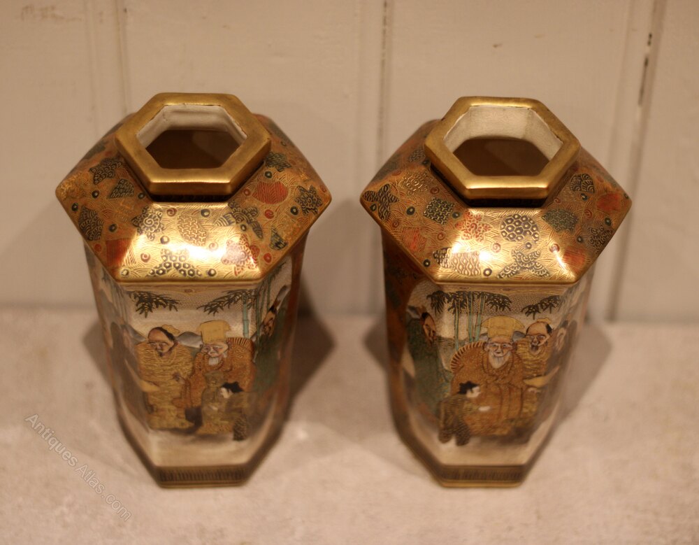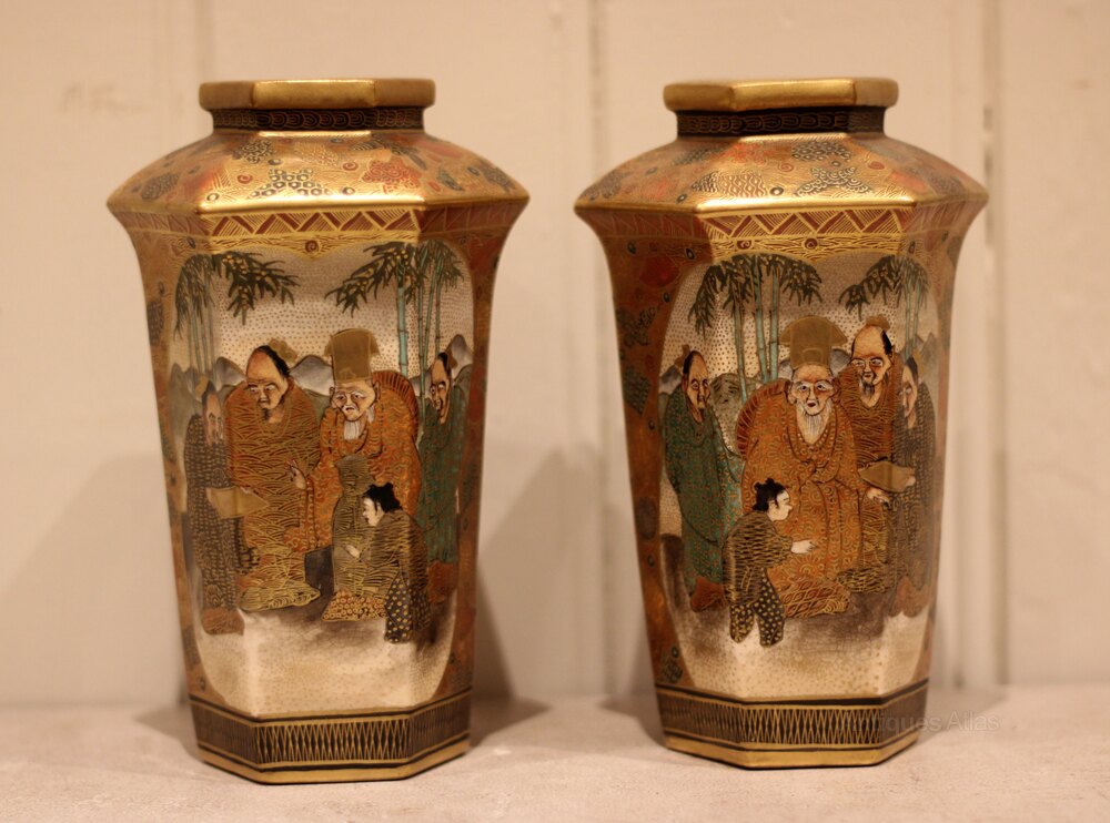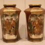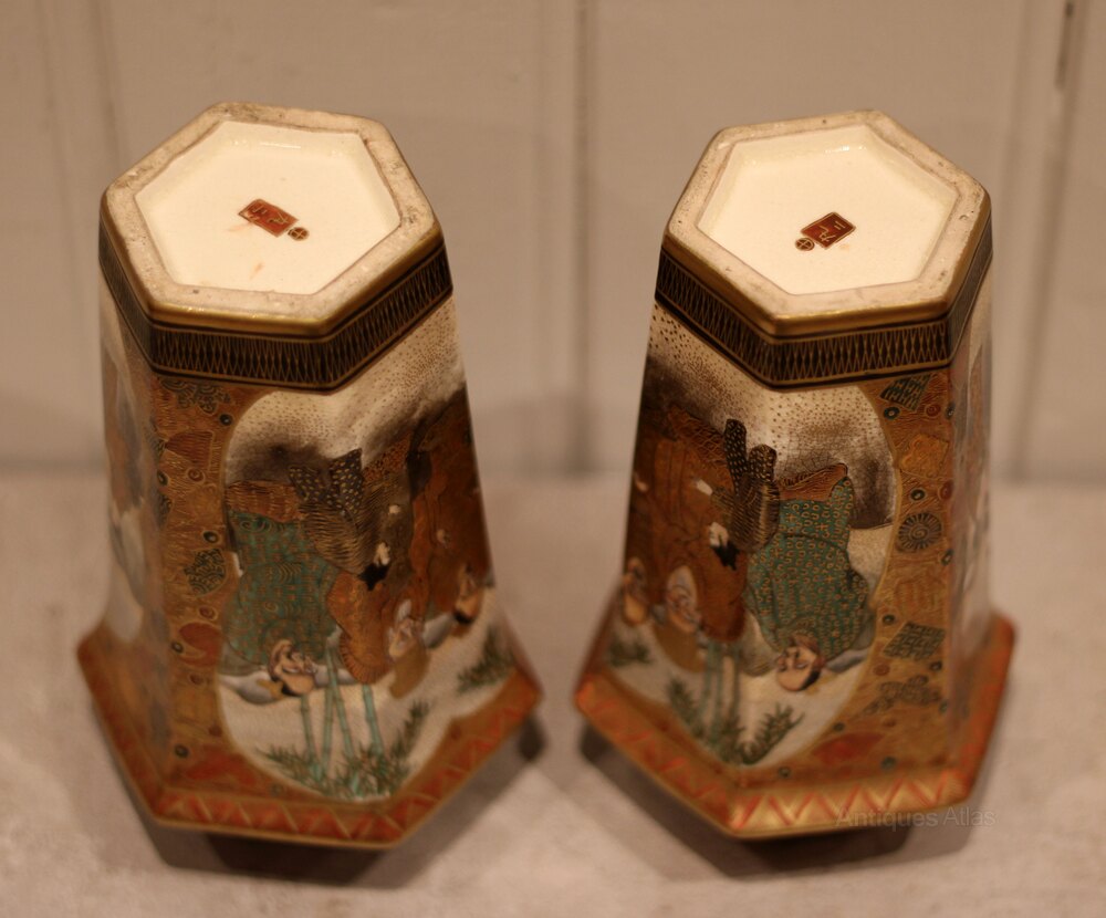 Pair of Japanese Satsuma vases having six decorated panels depicting figures , birds and flowers .Height