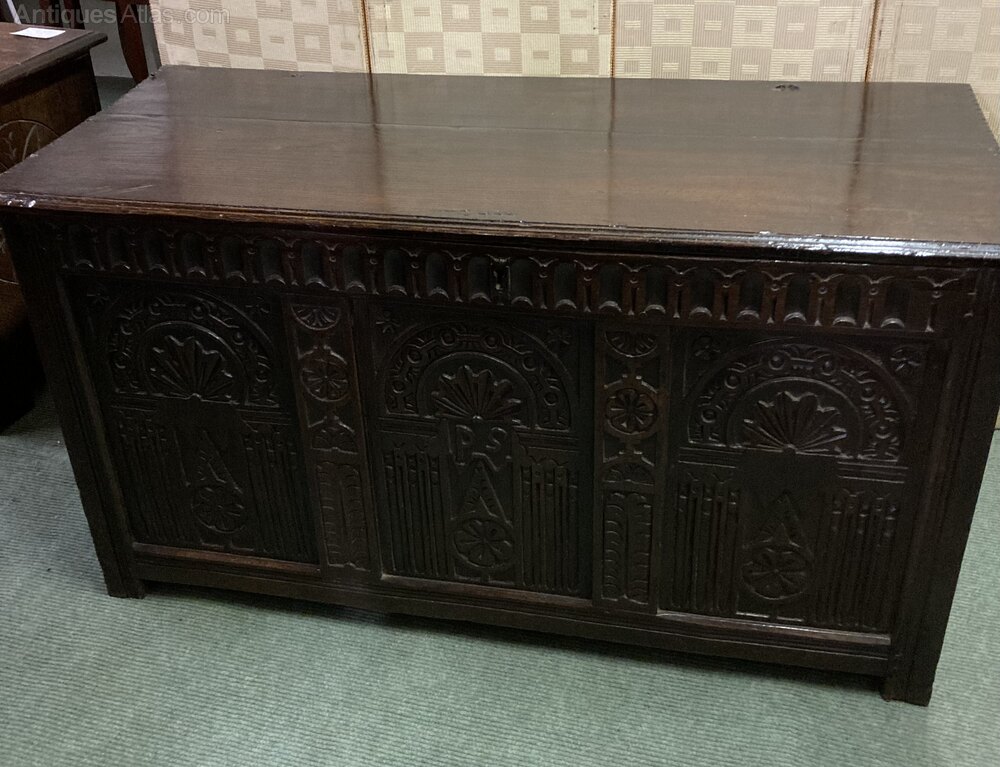 no-236-1600s oak carved coffer in good conditionDateLate 17th Century :