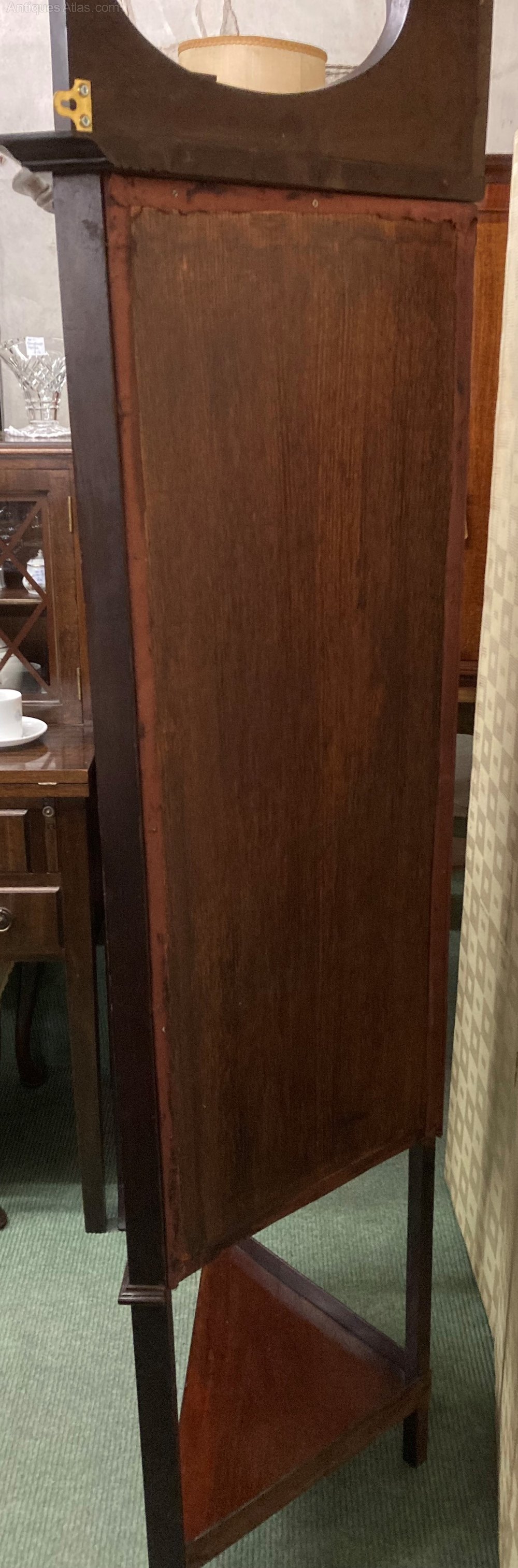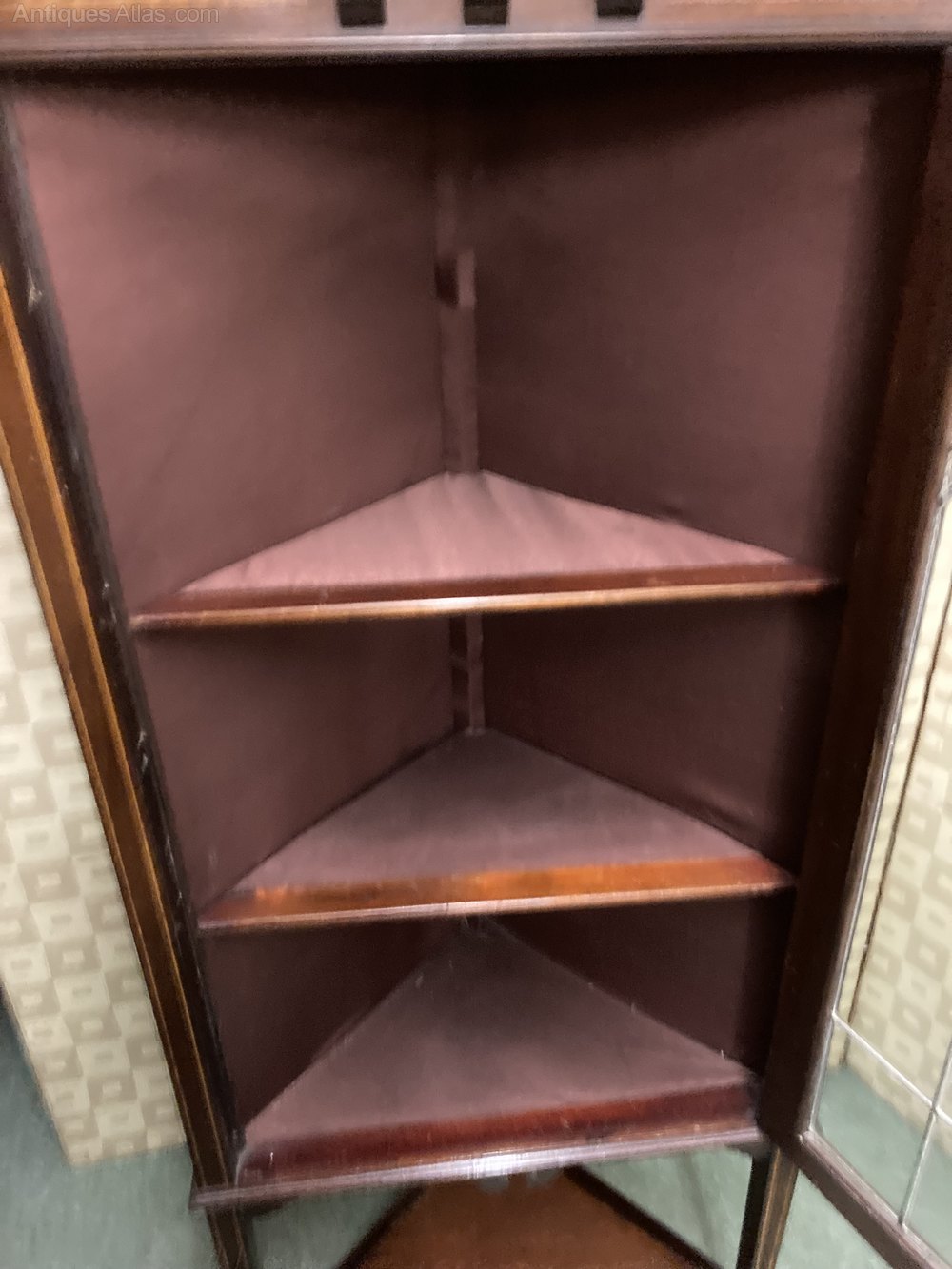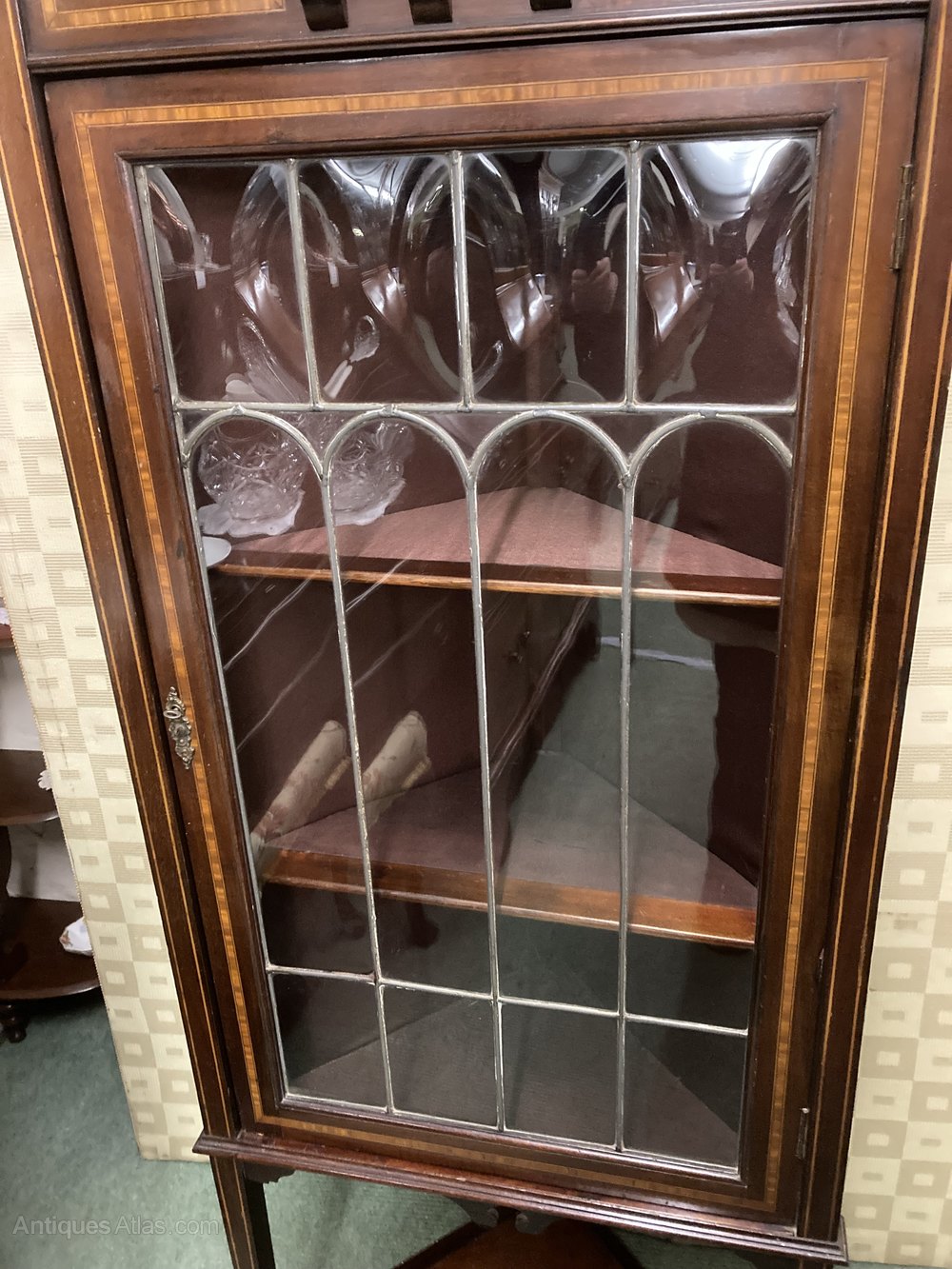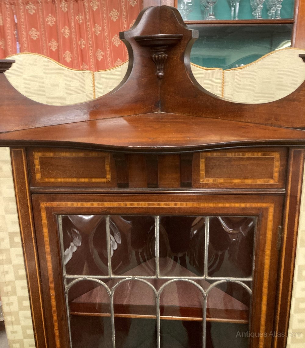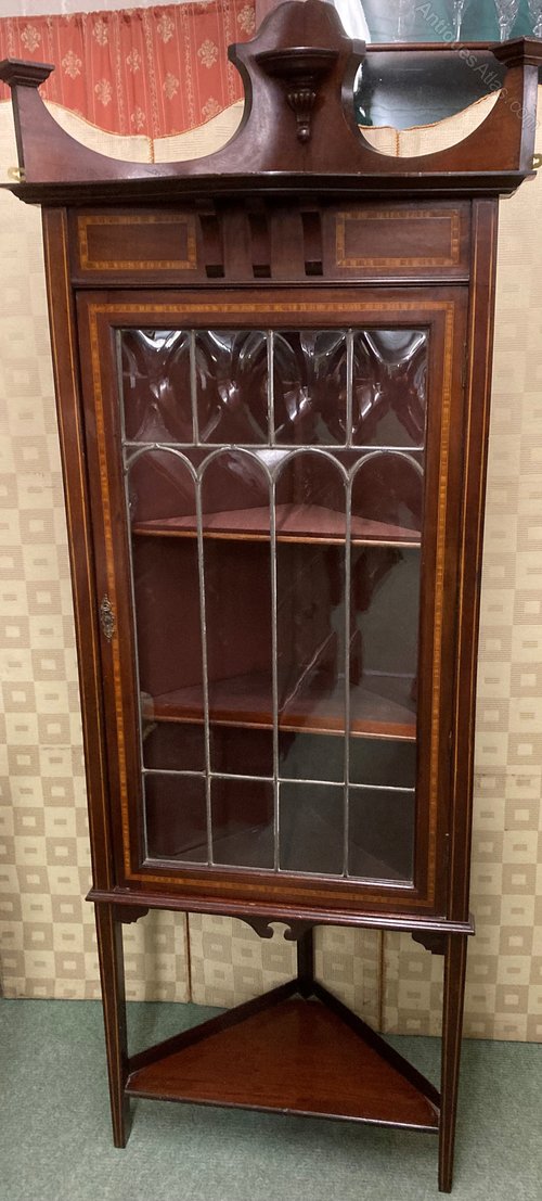 no-349-1901 Edwardian mahogany inlaid corner standing display cabinet with lead light door (this item needs to be fixed to the wall as the weight of the door when open will pull cabinet over ) in good conditionDateEdwardian :