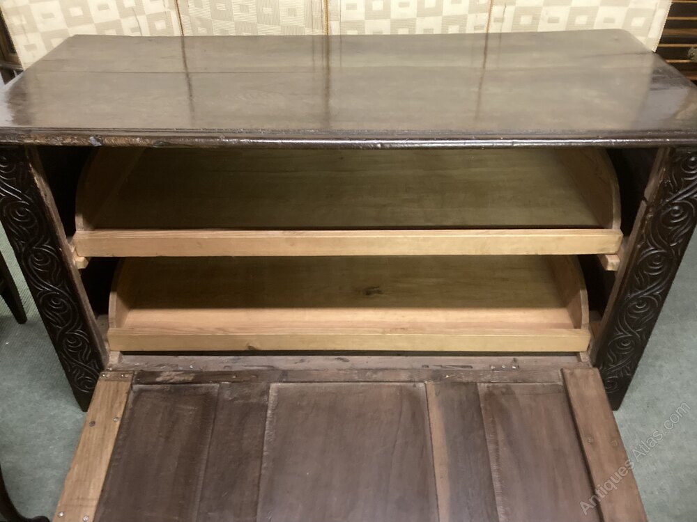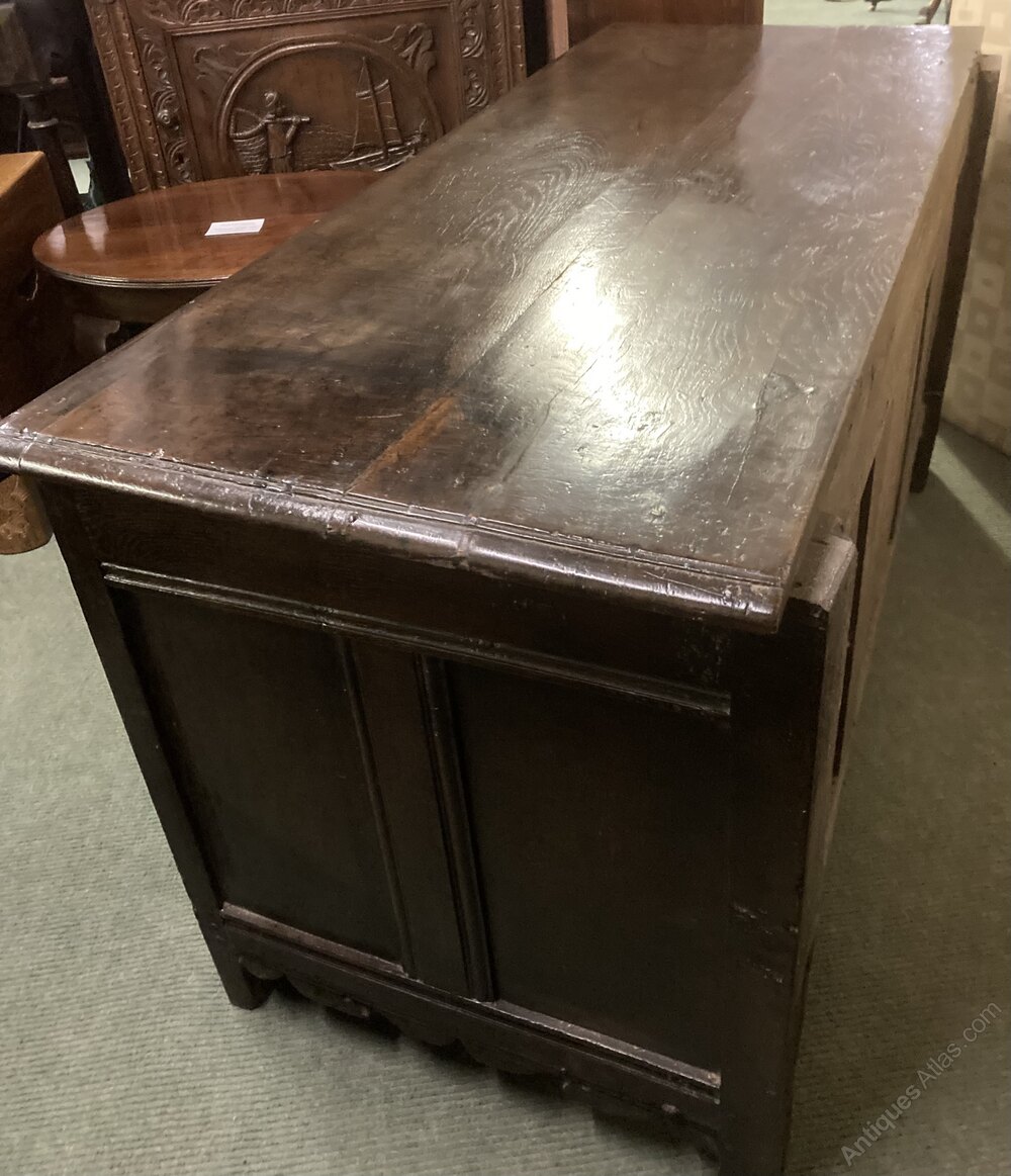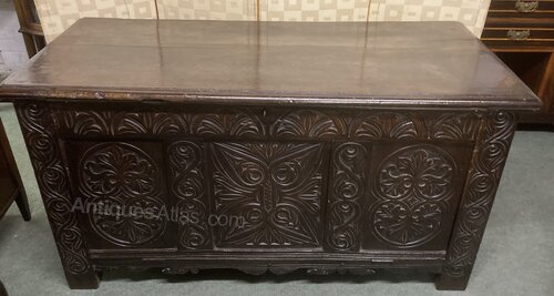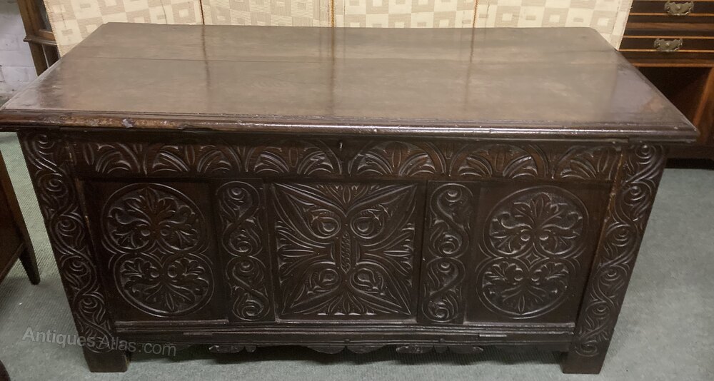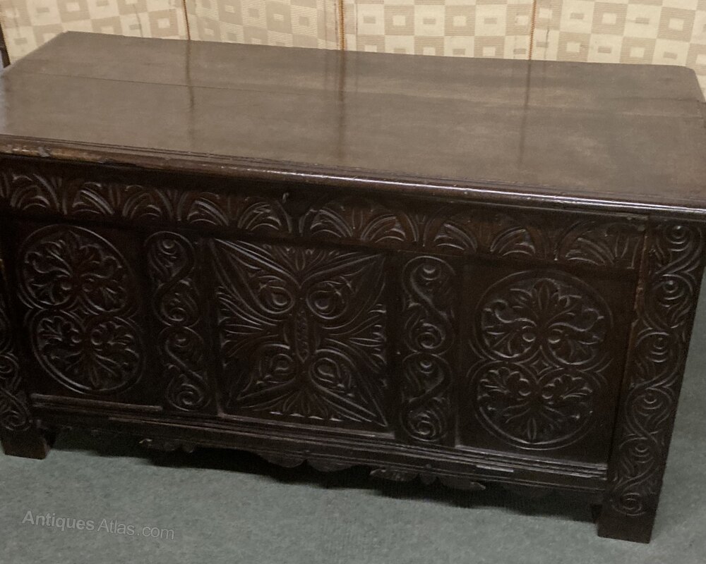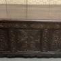no105-1600s oak carved coffer (been changed to front opening with butler slides )in very good conditionDateMid 17th Century :