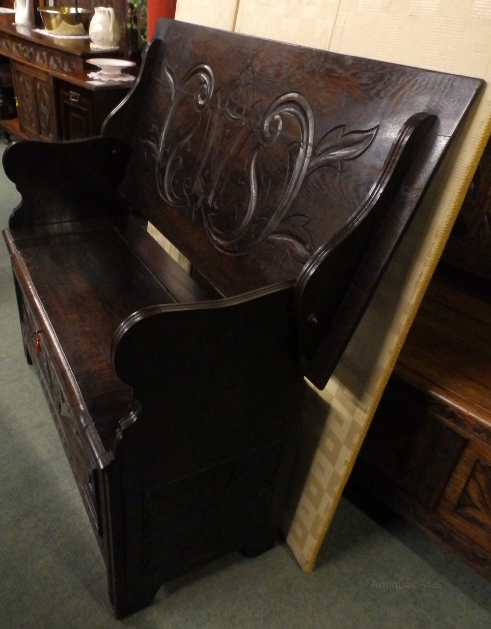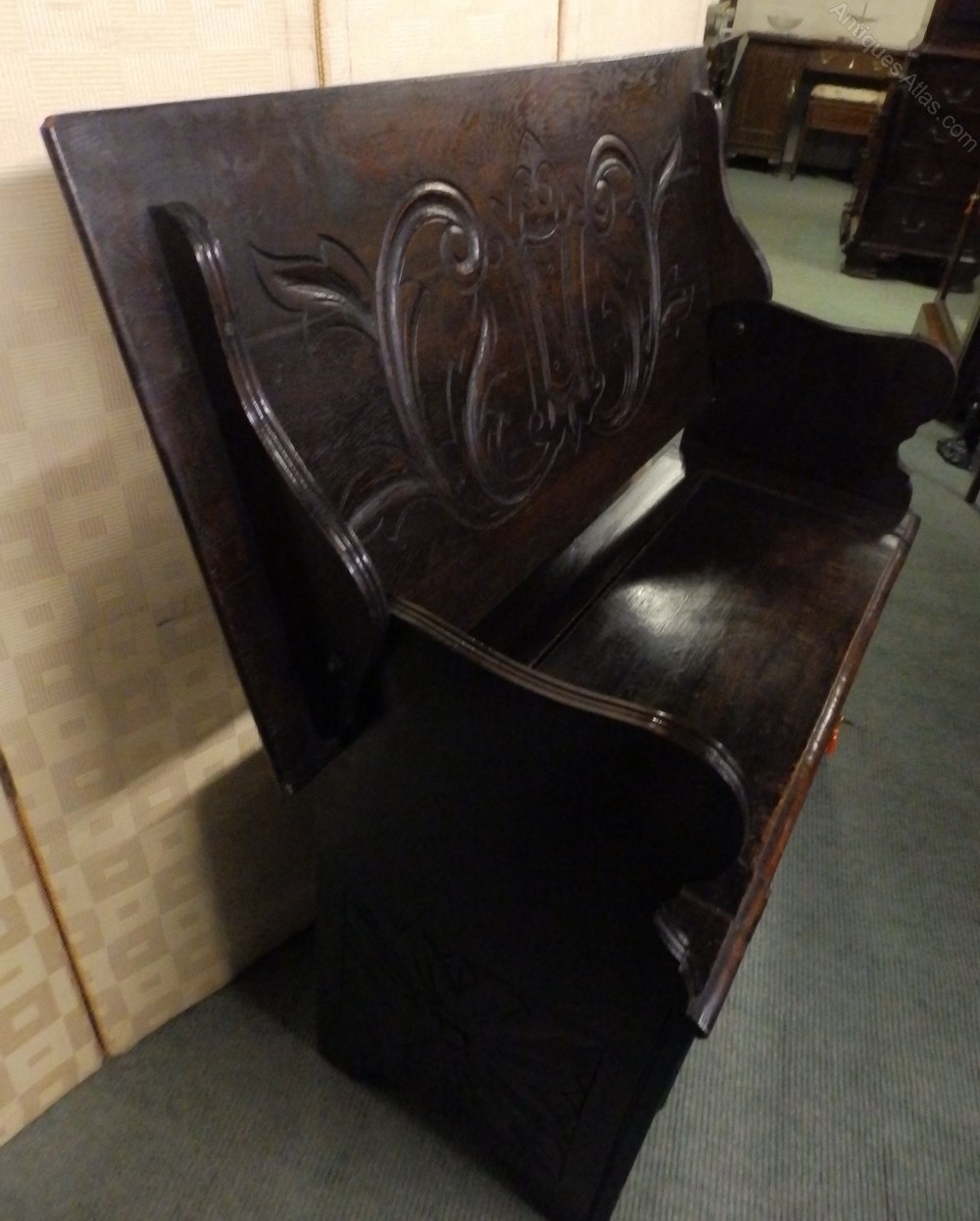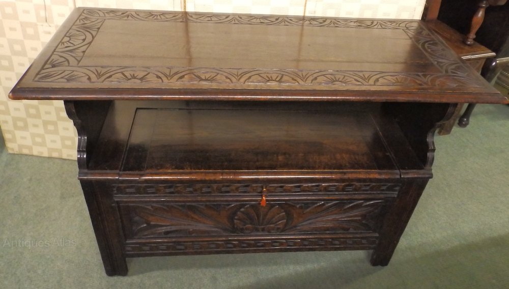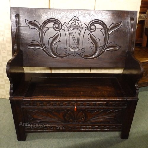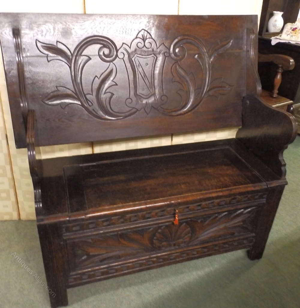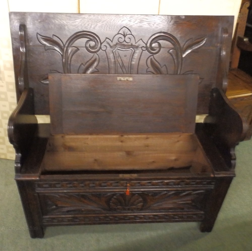 no-9-1900 late Victorian oak carved monks bench seat height 18" in good conditionDateEarly 20th Century :