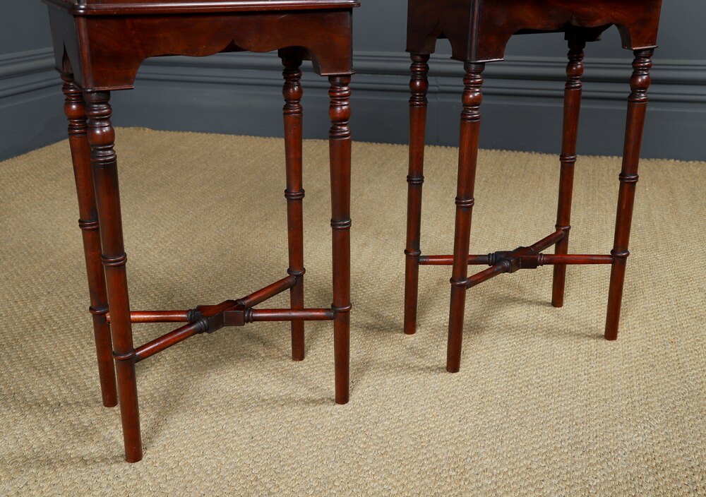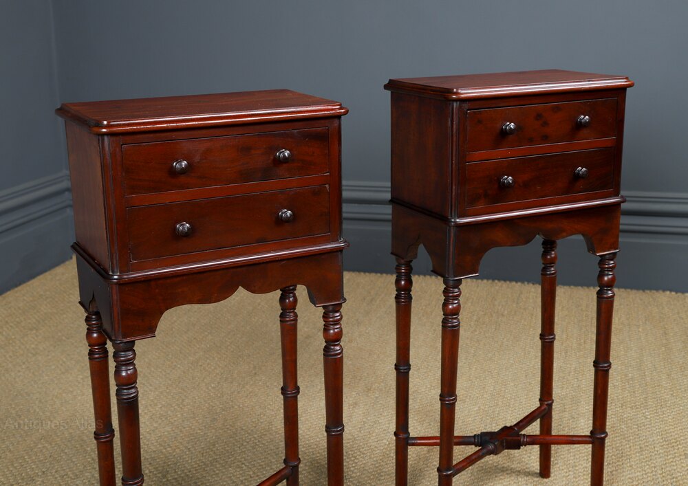 ConditionA fine quality English pair of Victorian antique small Mahogany bedside tables, with later adapted legs, constructed from figured mahogany, with two drawers and small proportions, circa 1840, in excellent condition. The bedsides have been adapted from a Victorian dressing table. The Victorian bedside tables have been cleaned and French polished by hand, to a professional standard, in our workshop. Therefore, the colour and patination of mahogany is of an excellent standard. Nominal old use marks to the tops, leading edges and inside the drawers, but nothing significant considering the age of the item. The frames are constructed of top-quality solid mahogany and drawer fronts from figured mahogany which gives a superb colour and patination. The Victorian tables are solid in joint and ready to use. This pair of mahogany nightstands are solid in joint, they do not wobble and are ready to use.