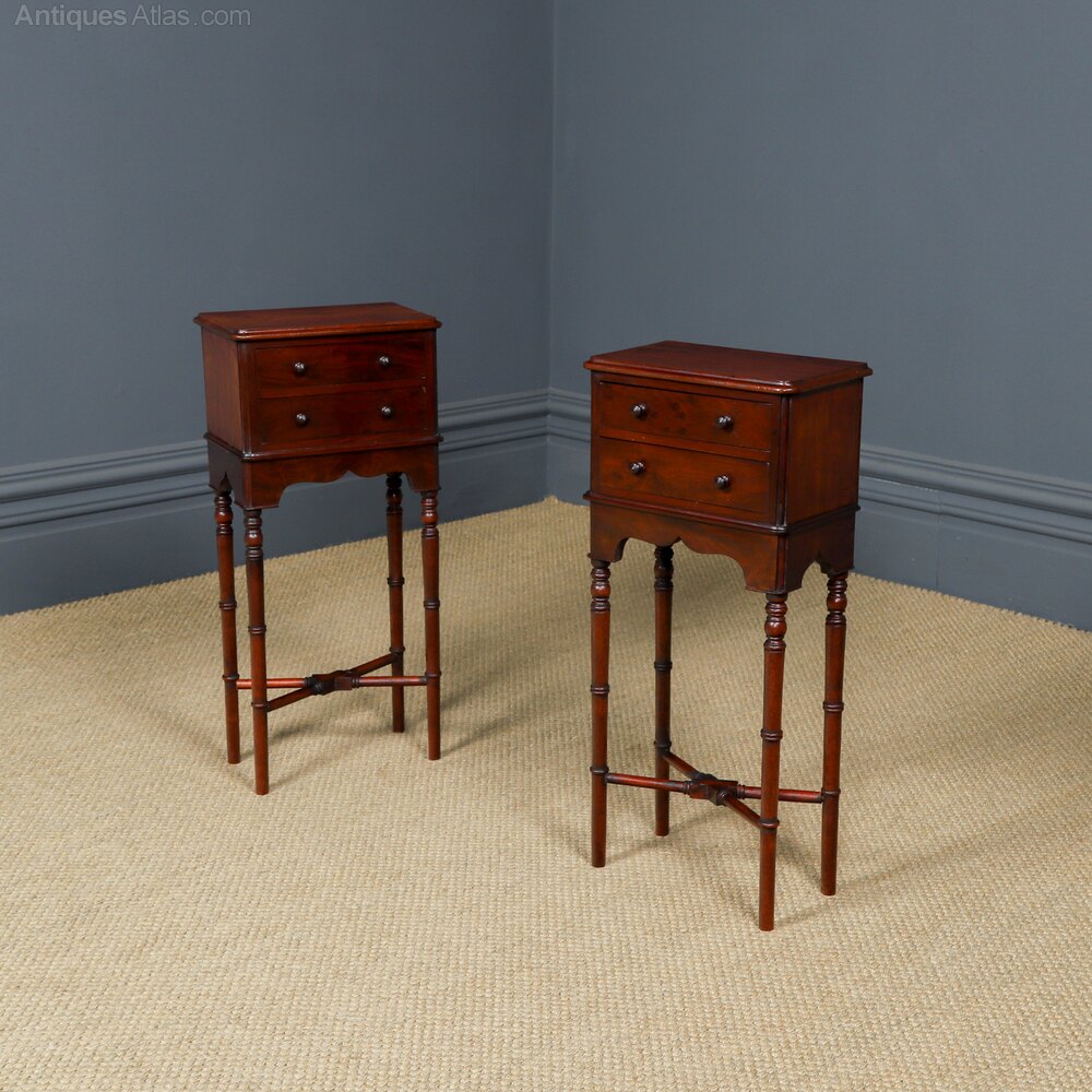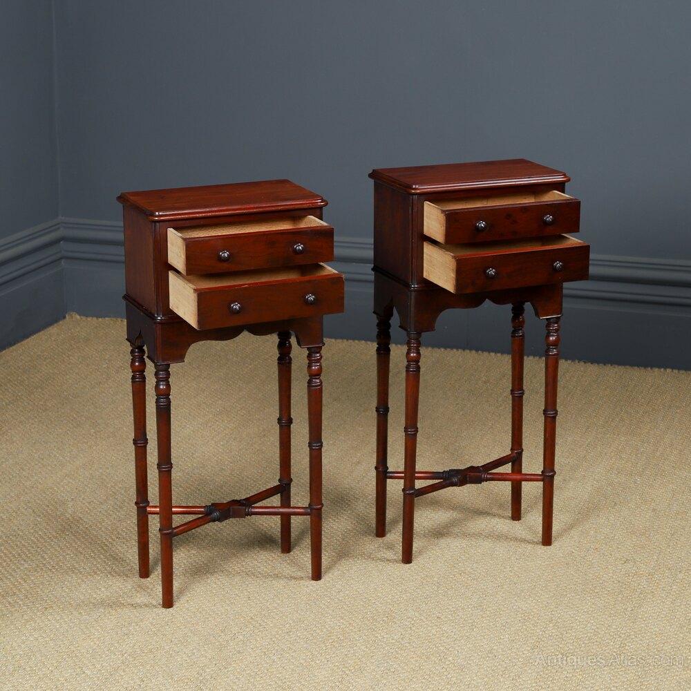 A fine quality English pair of Victorian antique small Mahogany bedside tables, with later adapted legs, constructed from figured mahogany, with two drawers and small proportions, circa 1840, in excellent condition.Summary: