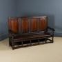 The oak hall bench boasts a rich dark-brown period oxblood colour. As it boasts the original polish, it has a fantastic colour, depth and patination this can only be achieved through the age and years of care and cleaning it has received.