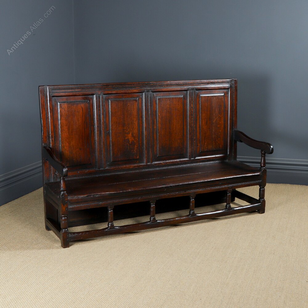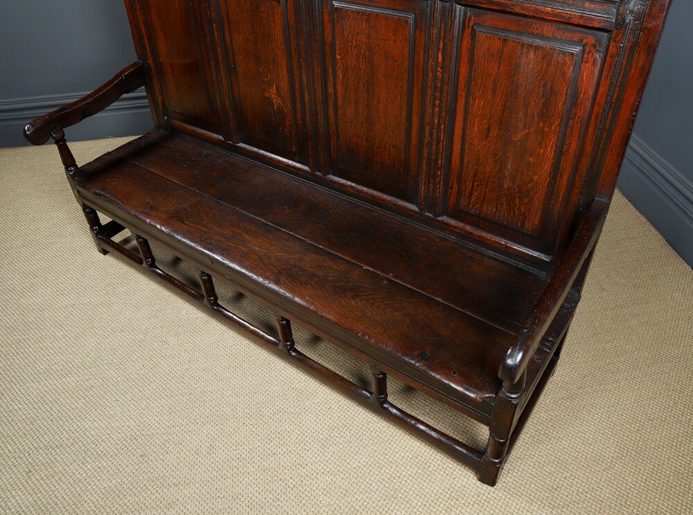 ConditionThis is a fine antique English 17th century oak settle / bench, from the Charles II period, circa 1680, comprising four panels, which measures 6ft 2” wide, boasting a stunning colour and in excellent original condition. Nominal old use marks to the leading edges, frame, sides but nothing significant considering the age of the item. There are no breaks to the frame or legs. The George II settle retains its original patinated surface, boasting a rich oxblood period oak colour. This large hall seat is solid in joint and has been wax-polished, by hand, in our workshop, to a professional standard. Therefore, the finish, colour and patination are of an excellent standard. The 17th century oak settle is well constructed, solid in joint and is ready to be used.