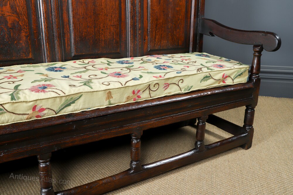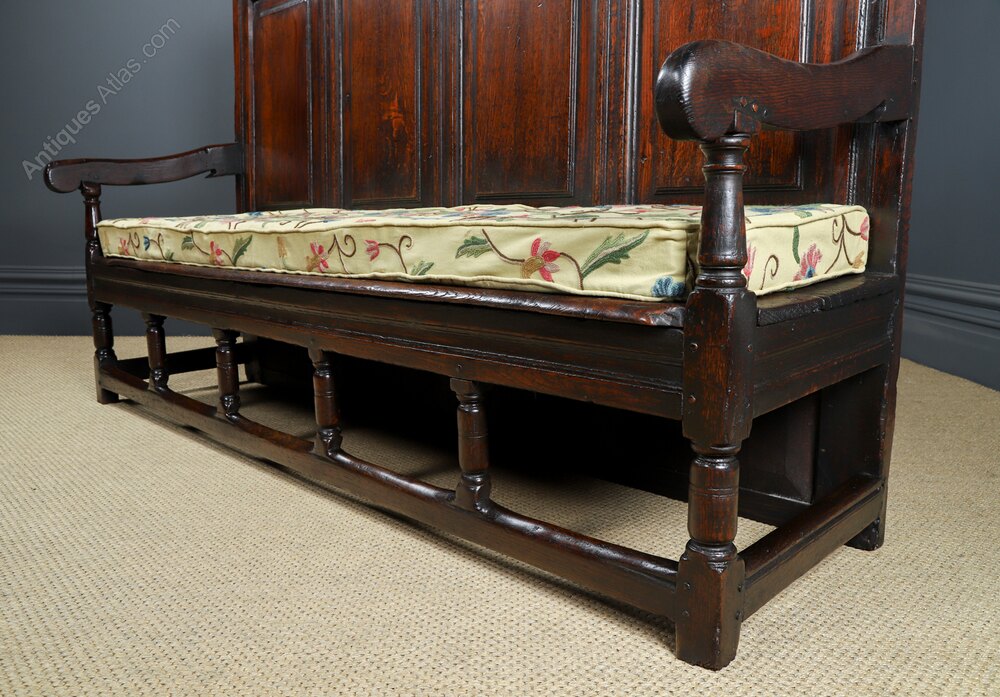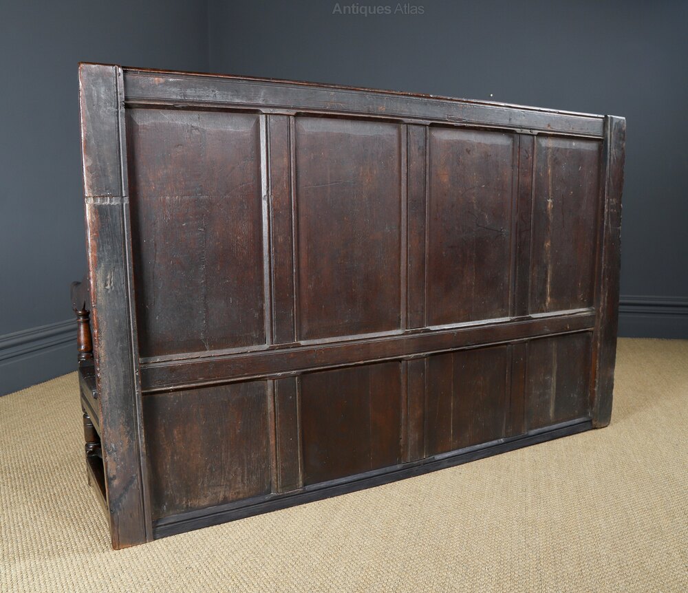 The 17th century oak settle frame has been constructed in the traditional manner with pegged and joined construction. It is unusual to see early oak settle of this size, in such good condition - this makes it highly desirable.