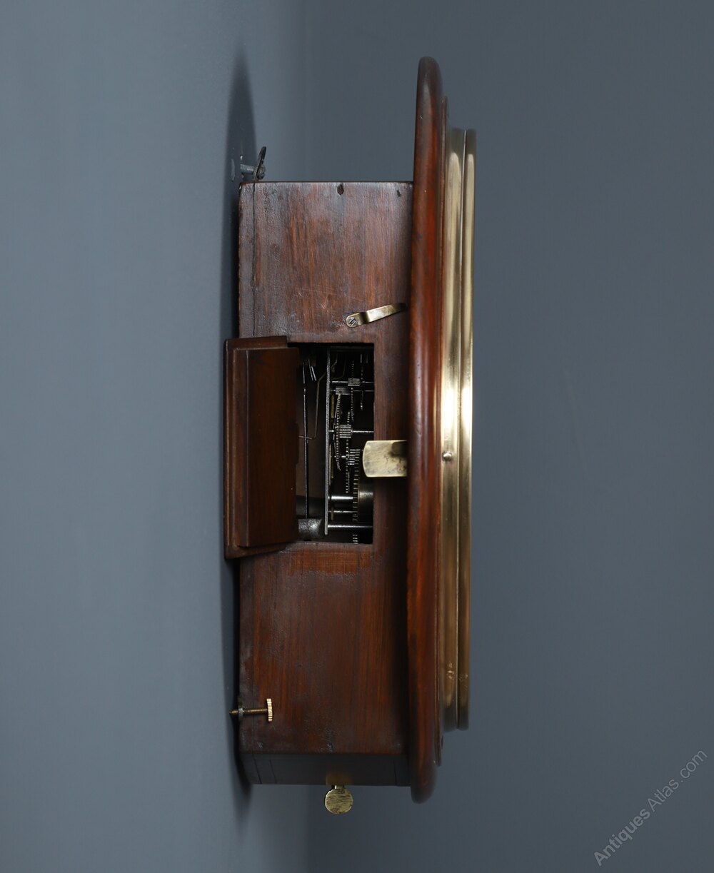This mahogany wall clock boasts a beautiful mahogany case, with a moulded brass bezel, a pendulum access door on the underside and a mechanism-viewing door on the left-hand side that allows you to view the mechanism whilst in operation.