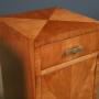 The pair of Art Deco nightstands retain their original metal handles the design of which mirrors the triangular shaped timbers. The cupboard doors also retain their original working brass lever locks (with working key). The drawers and doors open and close flush to the frame. The internal shelf in the cupboards is removable. The Art Deco bedside tables stand on moulded plinths and small bun feet.