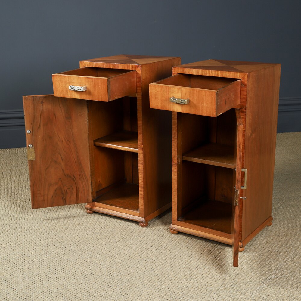 This is a good quality pair of Art Deco bedsides, with a symmetrical triangular design, constructed from quality mirror-matched walnut timbers, circa 1930, in good condition. Featuring a rectangular shape, the pair of Art Deco bedside tables are designed with symmetrical triangular -shaped walnut timbers around a cross-banded border, on a solid frame. The pair of Art Deco bedsides comprise a single working drawer with an enclosed cupboard below, which incorporates an internal removable shelf. This is a true pair of Art Deco bedside cupboards, with door hinges on opposite sides, so they can be used correctly, either side of the bed.