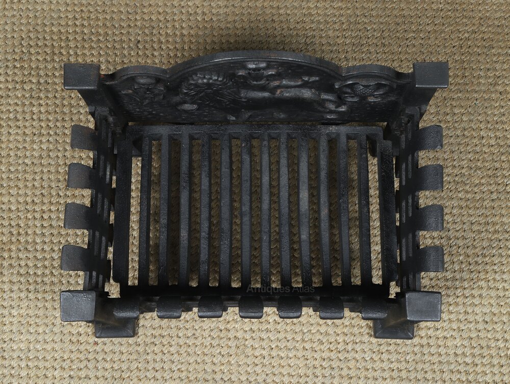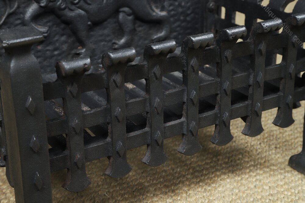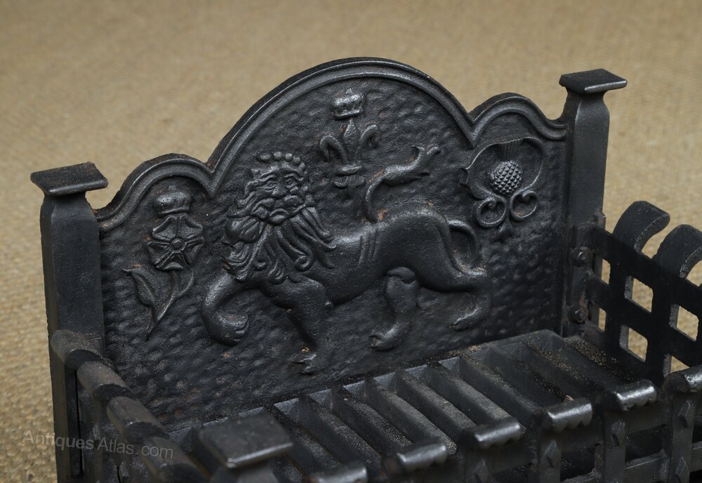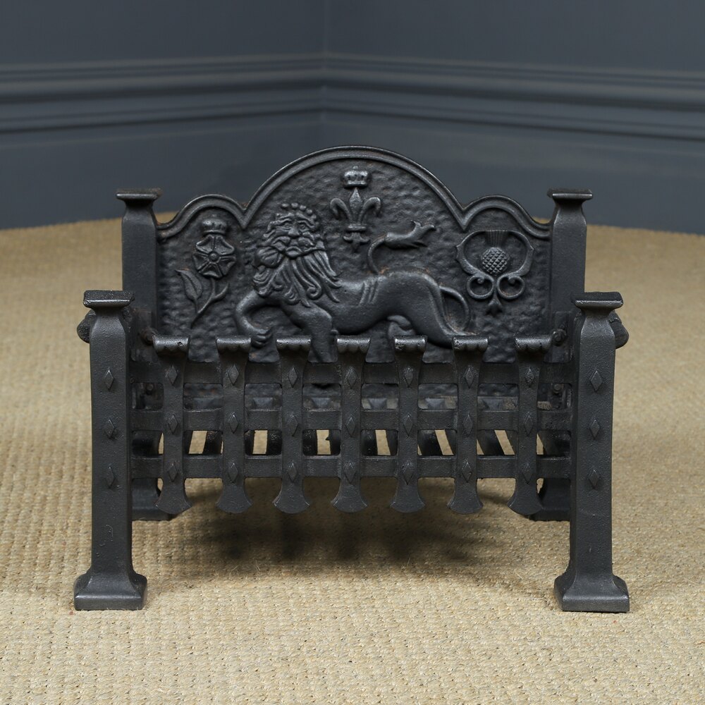 ConditionThis is a fine quality small English 19th century style neo-Gothic fire grate, embossed with an English lion, flanked by a Tudor rose and Scottish thistle, made from solid cast iron, circa 1920, in excellent original condition. The item is solid in joint and is robust. Nominal old use marks, but nothing significant considering the age of the item. There are no breaks to the cast iron. The internal grate floor is in good working condition. The grate features an attractive rustic finish, giving it a lovely colour and appearance. This log basket is reassuringly solid and heavy, and it is ready to use.