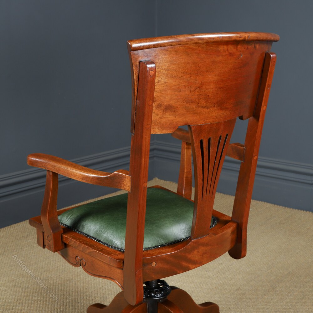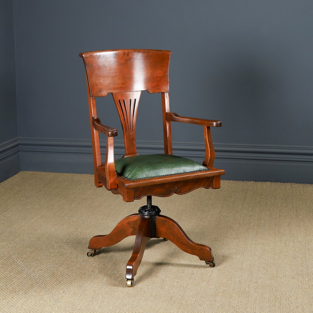 This is a fine quality antique English Edwardian Arts & Crafts desk chair, constructed in solid beech, featuring a revolving, reclining and height adjustable mechanism, circa 1910, in excellent condition. This antique revolving office chair features a curved bar back, secured by shaped arms and supported by an elegant splayed vertical high fan back (ideal for stronger back support). The chair seat has been newly upholstered in top quality full grain green leather, which has been finished with hand-tacked brass studs to the perimeter. The underside of the seat has been re-webbed in the traditional manner. The front and sides of the seat are decorated with a scroll shaped frieze. The chair mechanism has been restored and serviced and is in good working order. The Arts & Crafts desk chair incorporates a mechanism allowing it to rotate 360 degrees and recline backwards. The seat height can be adjusted by turning a ribbed metal screw on the underside of the chair. The office chair sits on four splayed solid beech legs which terminate on its original solid brass castors. Beech wood was a favourite choice of materials for chairs and seating, owing to it strong natural grain characteristics. The chair is extremely comfortable to sit on as it features a lovely padded seat with a high back.