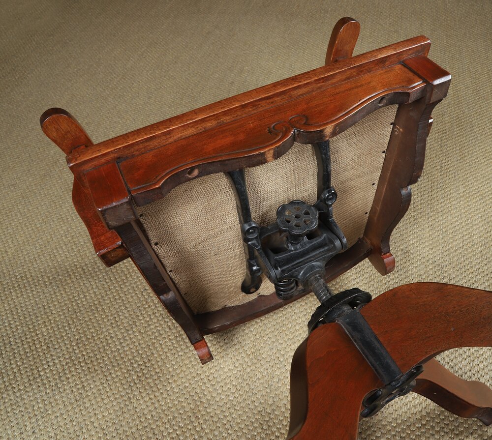The chair and mechanism are in excellent working condition. Nominal old use marks to the leading edges of the chair frame but nothing significant considering the age of the item. The chair seat has been newly upholstered in top quality full grain sage green leather, which incorporates the traditional brass studwork tacks to the seat perimeter and traditional hessian material to the underside. Therefore, the leather is in excellent new condition, with no wear, fading or damage. The reclining and adjustable height mechanism is in good working order, having just been cleaned and serviced. There is some play to the mechanism but this is perfectly acceptable, and in line with the age of the chair. The chair has been cleaned and French polished, by hand, to a professional standard, in our workshop, therefore the polish and patination is of an excellent standard. The chair sits on four splayed solid beech legs which terminate on its original solid brass castors. This desk chair is solid in joint and ready to use.