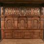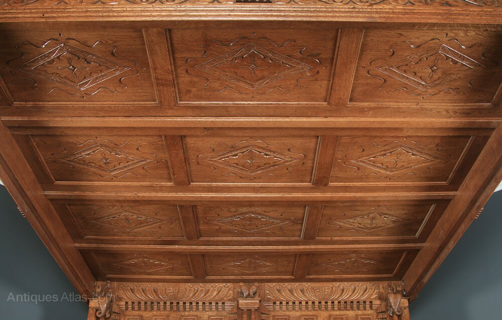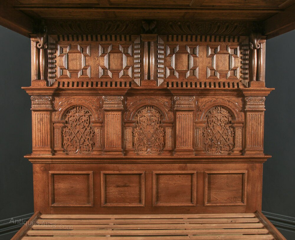 The Elizabethan four poster bed displays a stunning recessed panel roof, comprising four lozenge panels, which include scroll carvings and floral carved centres. The roof also boasts a detailed carved canopy, which incorporates reverse moulding, above shaped dentil moulding, below which is formal strap work arabesque rails, interspersed by foliate carved scroll shaped corbels.
