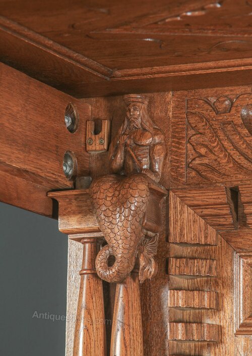 The headboard dismantles into two panels to allow easy access up narrow staircases or through doorways. The headboard is constructed of several carved panels and rails: to the top are two gadroon carved rails with floral centres. To the left, centre and right are three pairs of turned columns, with carved characters sat atop (Triton, a pair of fish and a mermaid, respectively). Separating the pairs of columns are geometric carved panels, with moulded dentil perimeters. Beneath these panels is a reverse-moulded rail, below which is a series of fluted square columns, interspersed with arched floral panels with arabesque carved centres. Further below is a second reverse moulded rail, above four simple moulded panels.