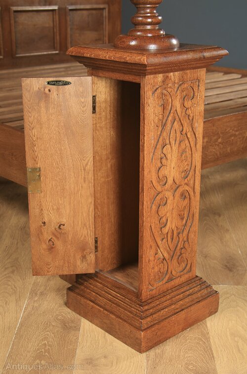 Two substantial carved posts support the canopy at the front, boasting arabesque carving, above a reeded ‘pot’, which in turn sits atop an arabesque carved cabinet, resting on a moulded plinth. Both cabinets retain their original working locks, each with a working key. Please note: the canopy-supporting posts are freestanding and not attached to the footboard.