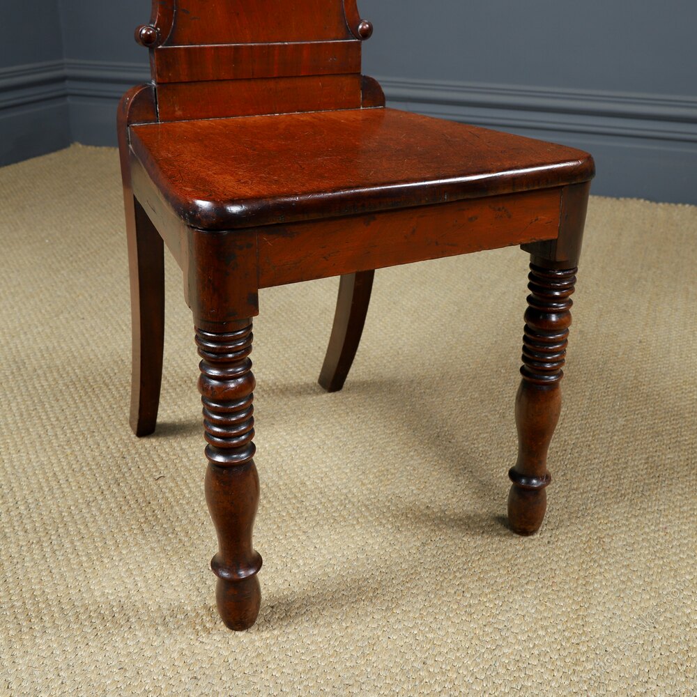 This is a fine quality antique English Regency mahogany hall chair, with a decorative back and solid seat, circa 1830, in excellent original condition. Also, ideal for use as an office / desk or occasional chair around the home. The decorative mahogany chair displays a floral cartouche, above an oval-shaped recessed back, flanked by button mouldings above a solid single panel mahogany seat. The chair stands on two bulbous ring-turned front legs, with splayed legs to the rear. The chair frame has been constructed in the traditional manner, with mortise and tenon joints, finished with pegged dowels.
