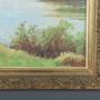 This is a good quality small antique English river landscape painting by J. Phipps, painted using acrylic on board, circa 1930, set within a good quality later gilt frame, in excellent condition. The board and acrylic paint are in excellent original condition – the picture display vibrant colours. The picture has been re-framed in a later good quality gilt frame, which is also in excellent condition. Nominal old age marks and wear to the leading edges of the gilt frame, but nothing significant, considering the age of the item. The back of the frame incorporates a board and hanging string. This river landscape painting is ready to hang.