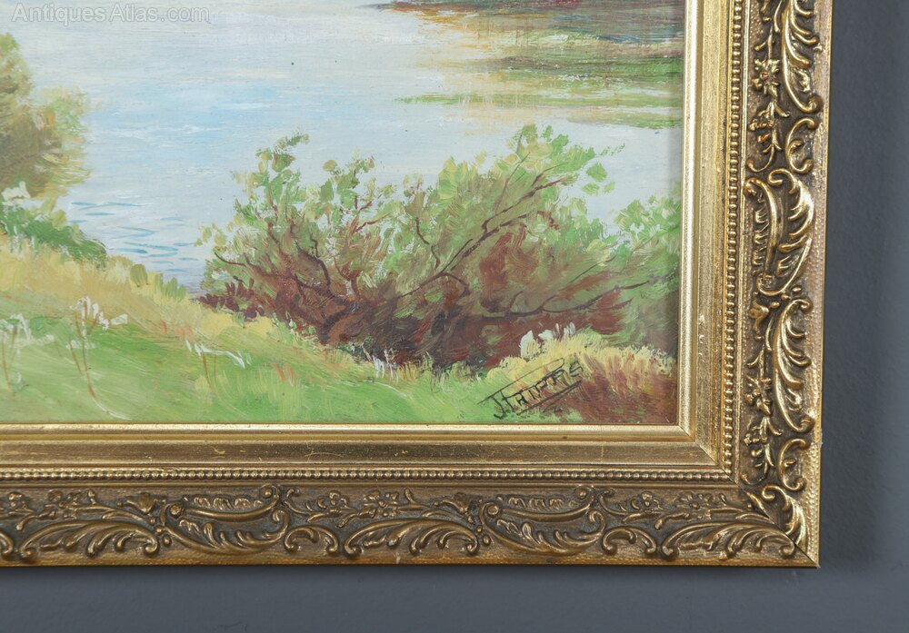 This is a good quality small antique English river landscape painting by J. Phipps, painted using acrylic on board, circa 1930, set within a good quality later gilt frame, in excellent condition.Summary: