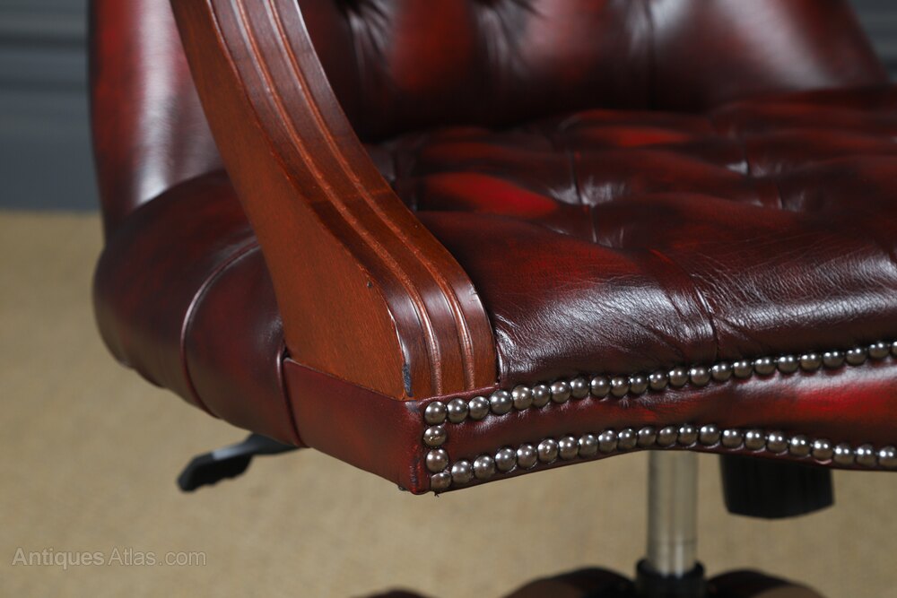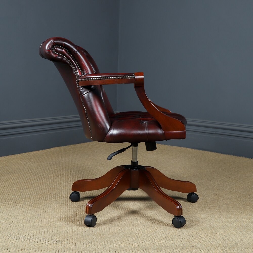 The chair mechanism is in good working order. The chair has been cleaned and polished, by hand, to a professional standard, therefore the colour and patination is of a high standard. This beautiful desk chair is extremely comfortable to sit on for long periods of time!