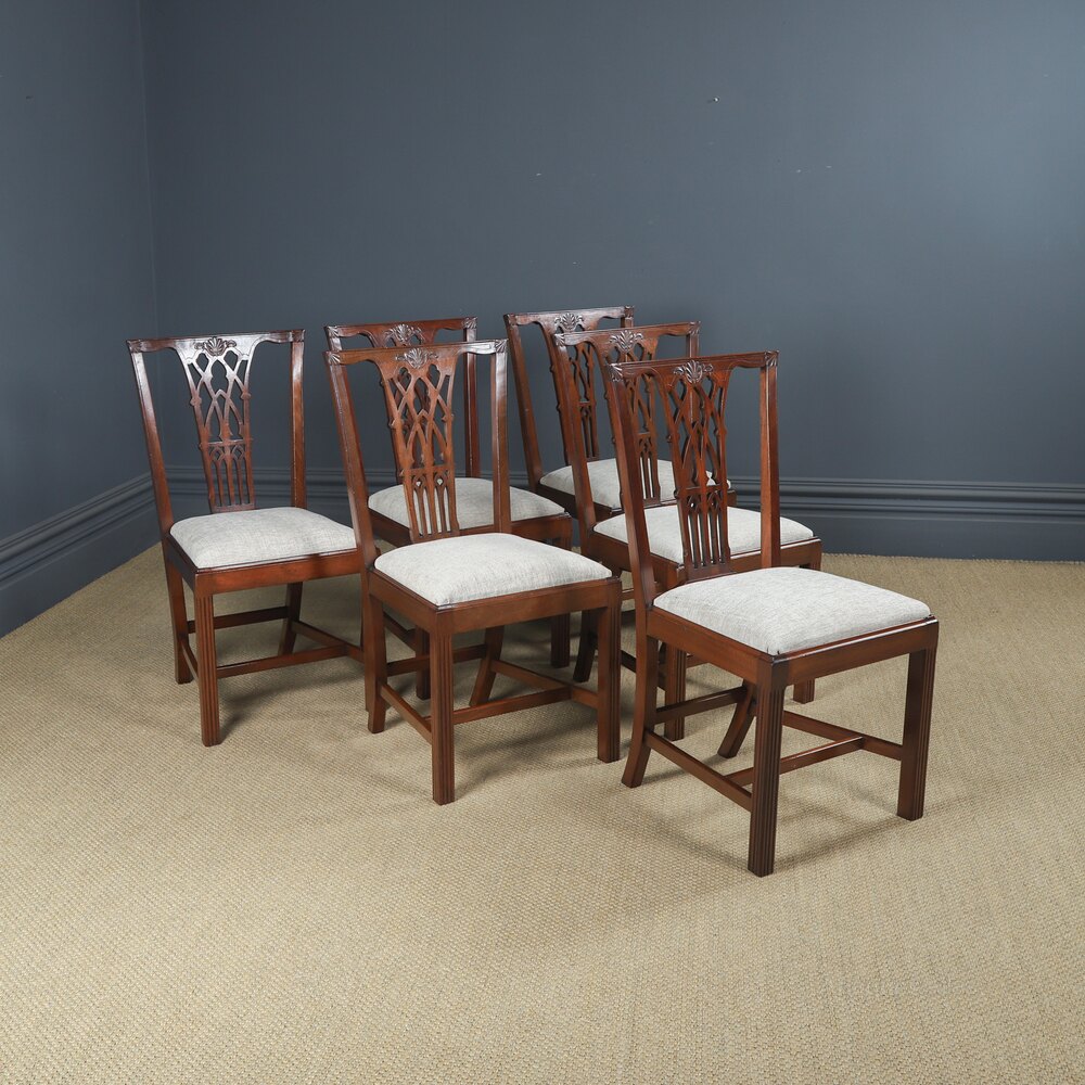 ConditionThis is a fine quality set of six antique English Chippendale style mahogany dining chairs, with a Neo-Gothic / Neoclassical design, circa 1890, with newly upholstered seats in excellent condition. The six Chippendale dining chairs have been cleaned and French polished and all loose joints have been glued in our workshop therefore, the chairs are solid in joint. The seats have been finished with tradition hessian backing to the undersides. Therefore, the seats are in excellent and clean condition, with no marks. The seats are well padded and firm but comfortable at the same time – you do not sink into the seat. If you do not like the fabric, we will recover the seats in a fabric of your choice (we charge £25 labour per seat). As these six mahogany dining chairs retain the original patination, the frames boast a lovely original colour. They are a heavy set of chairs, which is a good sign of quality. They are solid in joint (not loose or wobbly) and are ready to use.