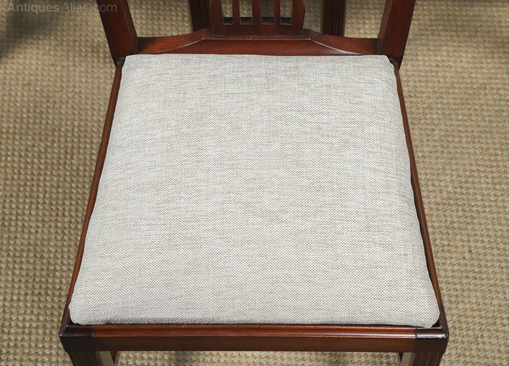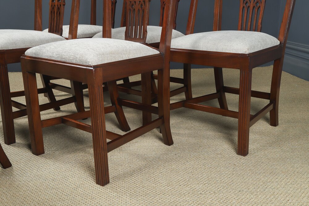 This is a fine quality set of six antique English Chippendale style mahogany dining chairs, with a Neo-Gothic / Neoclassical design, circa 1890, with newly upholstered seats in excellent condition. The six Chippendale dining chairs have been cleaned and French polished and all loose joints have been glued in our workshop therefore, the chairs are solid in joint. The seats have been finished with tradition hessian backing to the undersides. Therefore, the seats are in excellent and clean condition, with no marks. The seats are well padded and firm but comfortable at the same time – you do not sink into the seat. If you do not like the fabric, we will recover the seats in a fabric of your choice (we charge £25 labour per seat). As these six mahogany dining chairs retain the original patination, the frames boast a lovely original colour. They are a heavy set of chairs, which is a good sign of quality. They are solid in joint (not loose or wobbly) and are ready to use.