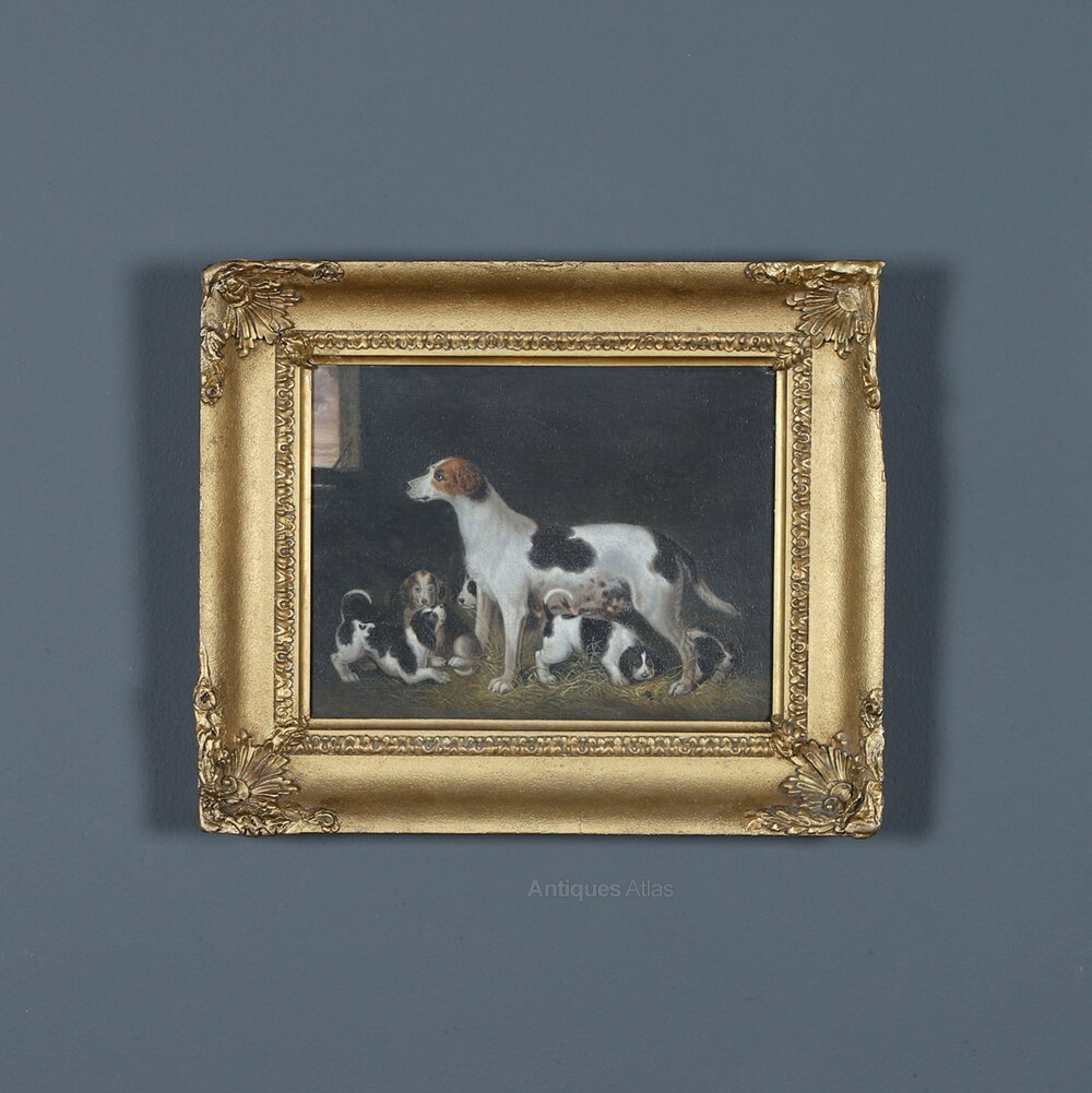 This oil painting, which is painted directly onto an oak panel, is extremely well painted and sits within its original fine quality ornate gilt frame, which is also in excellent condition. Five pups straddle playfully at the feet of their mother the pup in the foreground is captivated by a spider it has spotted in the straw. The left side of the Samuel Raven painting reveals a window in the stable, whilst the background is dark this enhances the black and tan of the hounds.